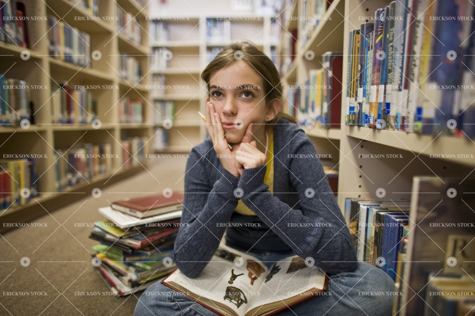Tags blue jeans, book, bookshelf, brunette, casual clothes, caucasian, child, contemplate, copy space, cross-legged, daydream, denim, discover, Education, emotional stress, female, frustrated, frustration, girl, girls, hand on chin, homework, horizontal, indoor, indoors, inside, jeans, kid, kids, learn, learning, leisure, leisure activities, leisure activity, libraries, library, look up, looking up, negative space, one person, over-burdened, over-worked, overburdened, overwhelmed, overworked, pensive, people, person, pre-adolescent, pre-adolescents, Pre-teen, pre-teens, preteen, preteens, public building, pupil, pupils, read, reading, recreation, recreational pursuit, recreational pursuits, selective focus, shelf, shelves, sit, sitting, stress, stressed, stressful, student, students, studying, teenage girl, teenager, thinking, thoughtful, three quarter length, tween