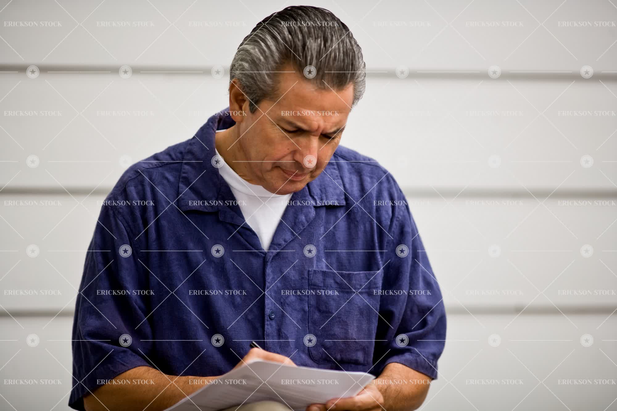 Mature man frowning while looking down and writing on a piece of paper.