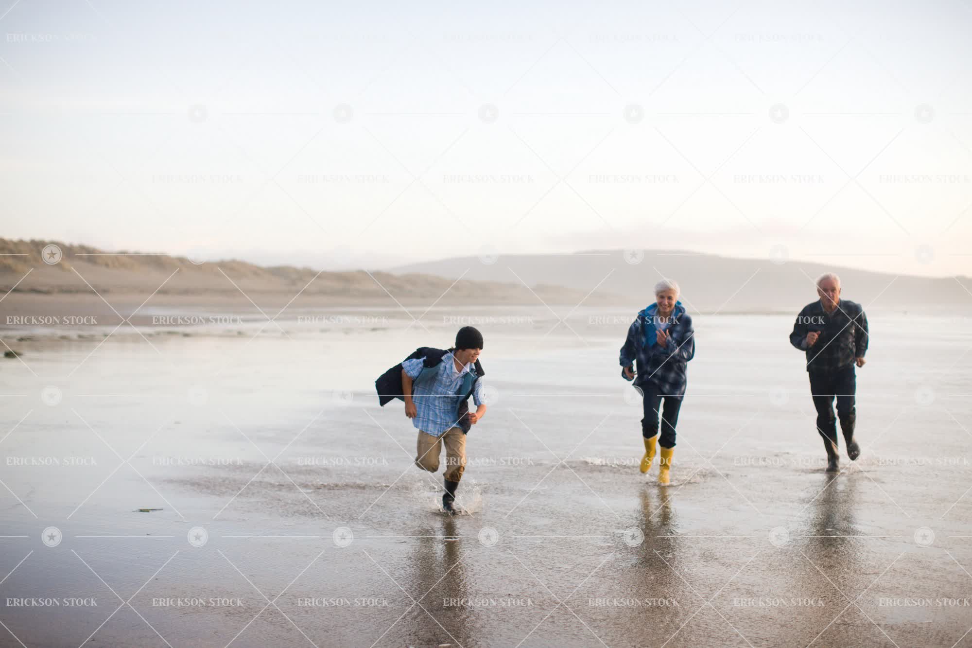 Smiling boy running along a remote beach with his grandparents while wearing gumboots.