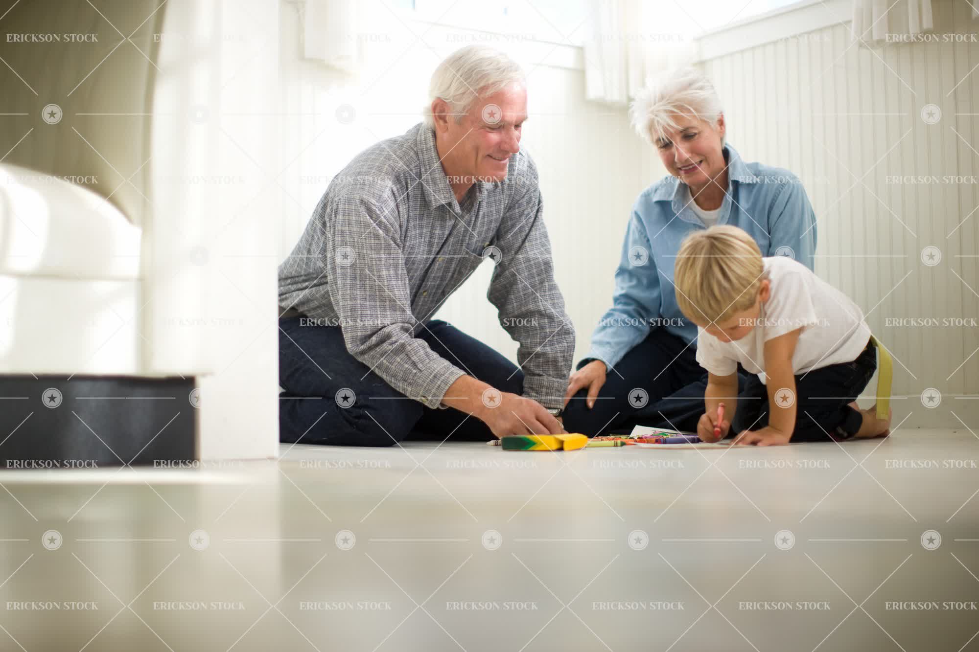 Young boy sitting on the floor with his grandparents and drawing with crayons.