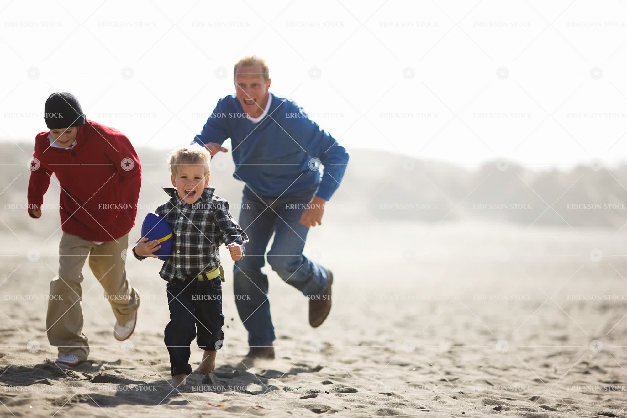 Portrait of a young boy running with a ball while being chased by his brother an mid-adult father along a beach.
