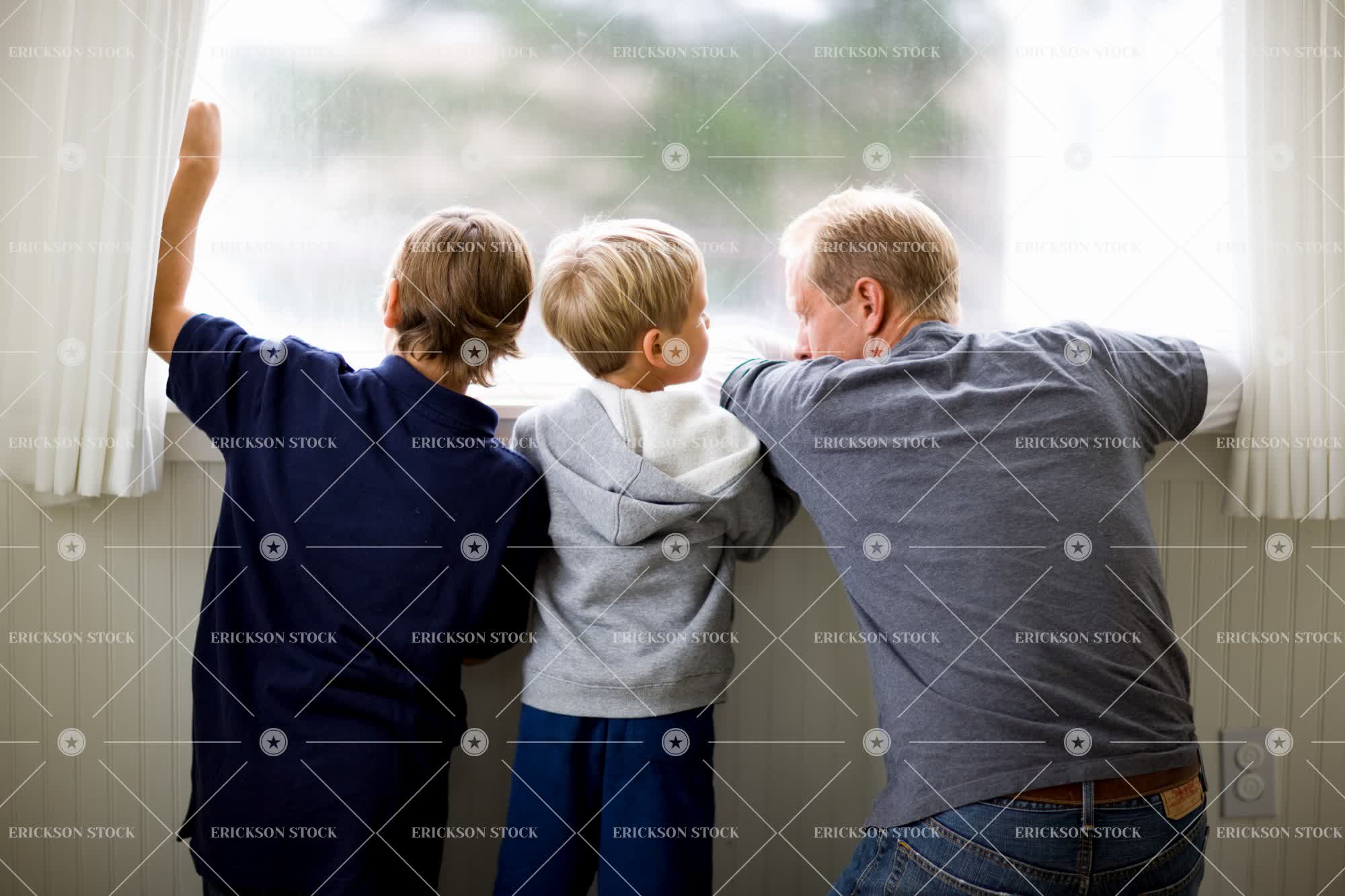 Mid-adult man looking out a window with his two sons.