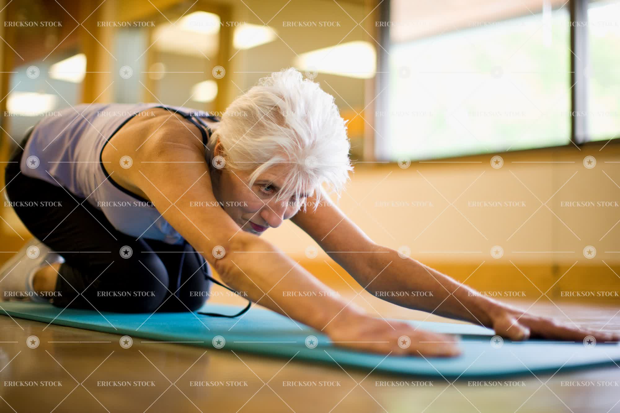 Tags adult, caucasian, copy space, copy space right, day, exercise, exercise clothing, exercise mat, exercise mats, exercises, exercising, female, fit, fitness, full length, gray hair, grey hair, gym, gym clothes, gym clothing, gyms, health, health club, health clubs, healthy, healthy lifestyle, horizontal, indoor, indoors, inside, lifestyle, lifestyles, mature adult, mid adult, negative space, negative space right, one person, people, person, selective focus, senior adult, serene people, serenity, spirituality, sports clothing, sports training, sportswear, stretch, stretching, training, wellbeing, woman, work out, working out, yoga, yoga mat, yoga mats, zen, zen-like