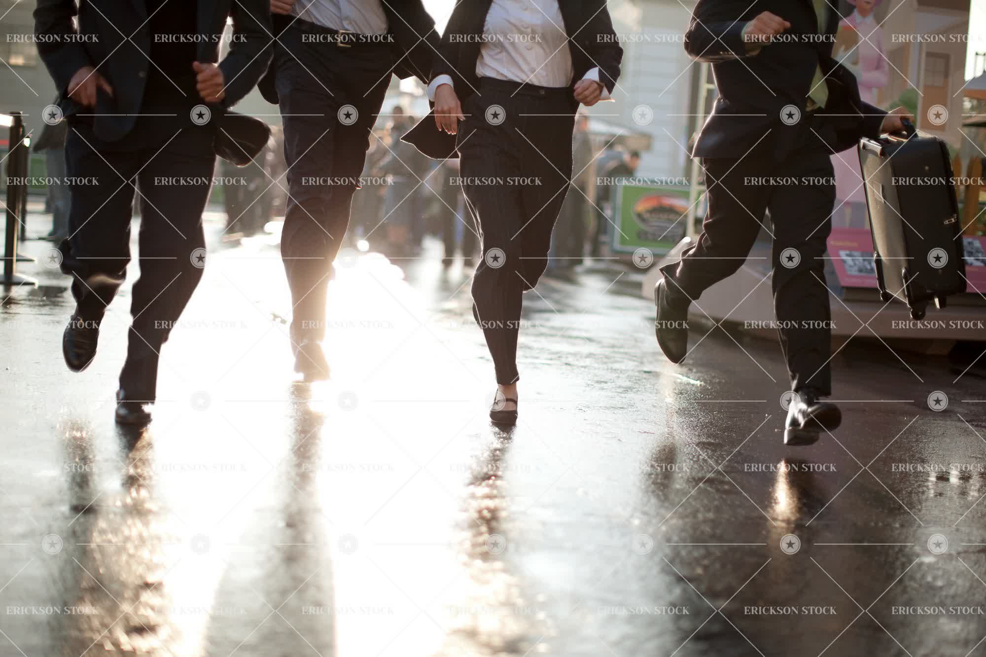 Four suited businesspeople running along a wet pavement in the city.