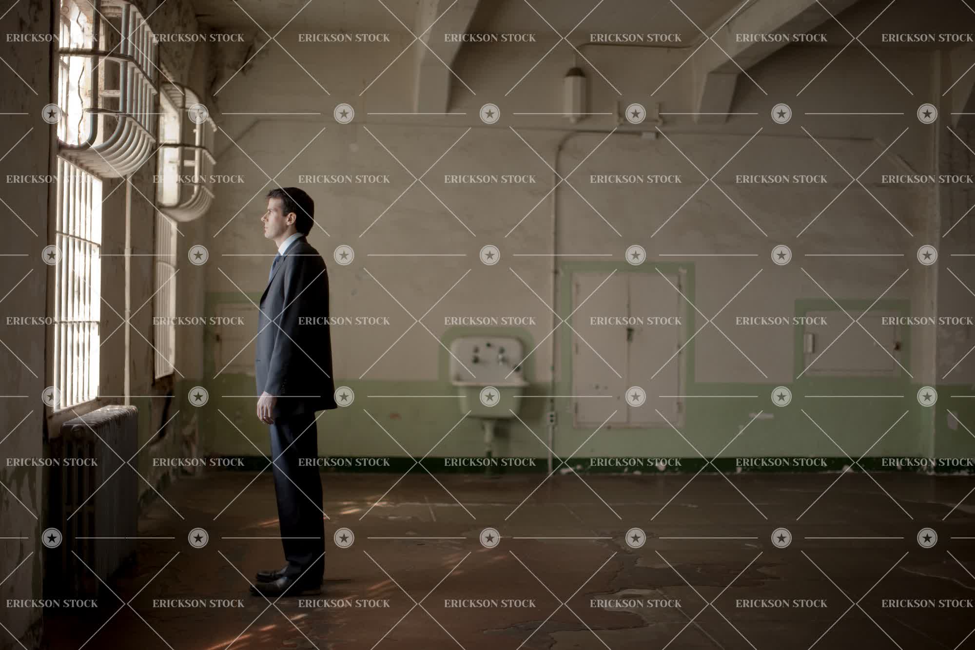 Suited mid-adult businessman standing inside an abandoned building while looking out the window.