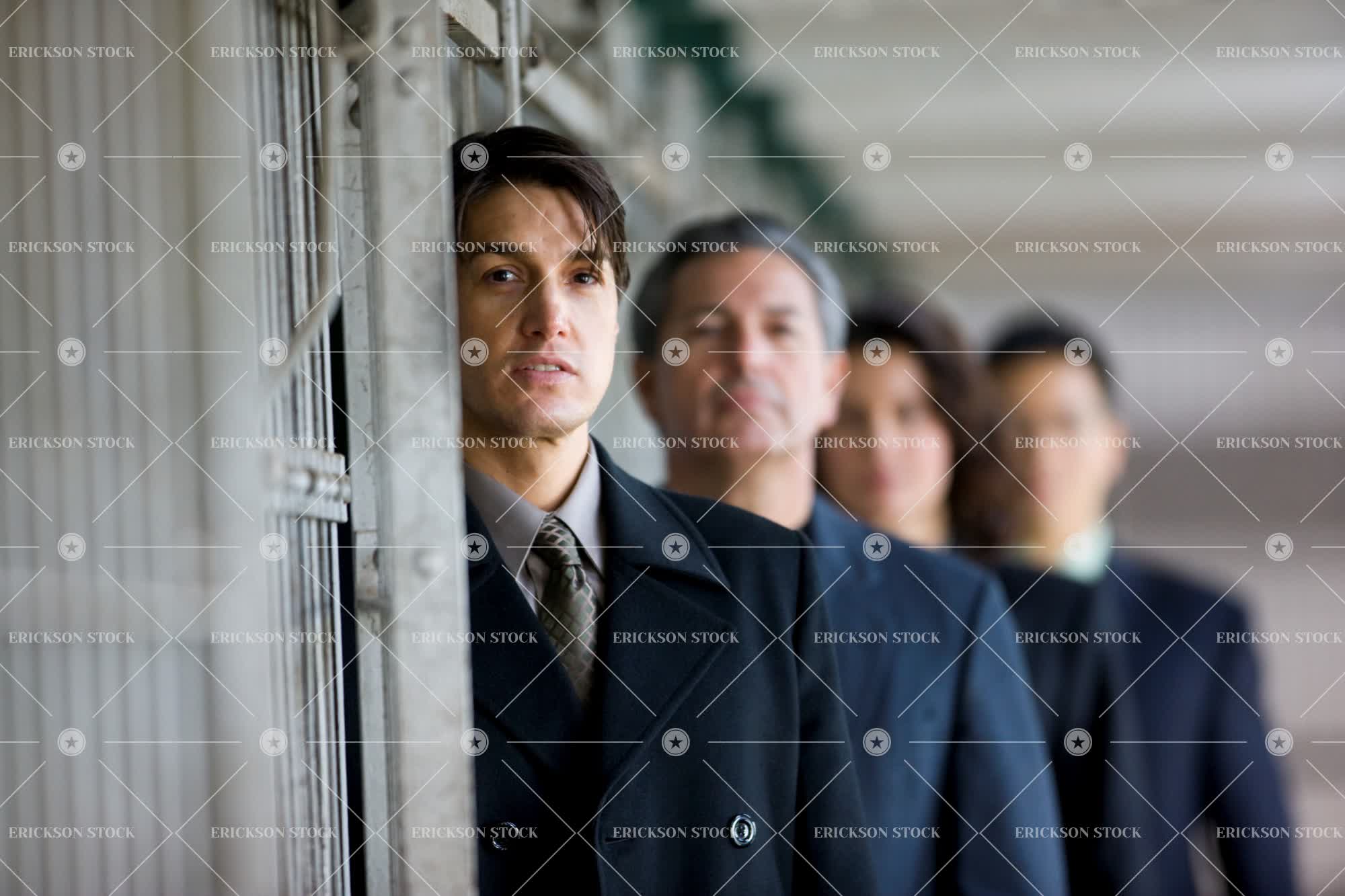 Tags adult, asian, bar, business, business attire, business man, business woman, caucasian, cell, cell door, confine, crime, day, door, Eye contact, female, head, head & shoulders, head and shoulders, head shot, headshot, horizontal, in a row, in rows, indoor, indoors, inside, jail, lined up, look at camera, looking at camera, male, man, mature adult, mid adult, people, prison, prisoner, prisoners, punish, punished, punishment, row, rows, selective focus, serious, seriously, shoulders, stand, standing, stern, suit, suits, team, trap, trapped, white collar crime, woman, young adult
