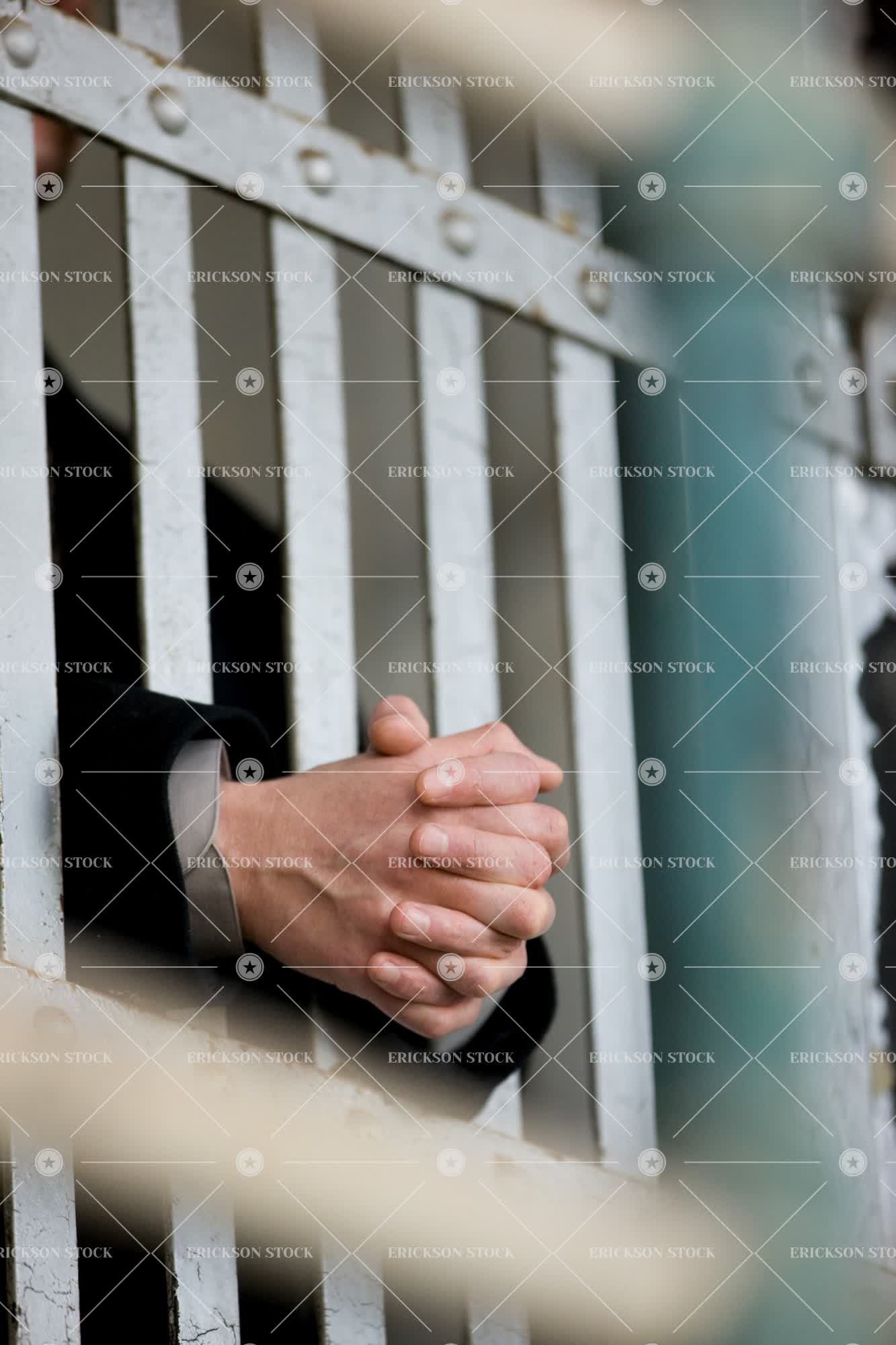 Tags adult, bar, business, business attire, cell, cell door, confine, crime, day, door, hand, Hands, hands clasped, hands together, human hand, human hands, indoor, indoors, inside, jail, male, man, one person, part of, people, person, prison, prisoner, prisoners, punish, punished, punishment, selective focus, suit, suits, trap, trapped, unrecognizable people, unrecognizable person, vertical, white collar crime