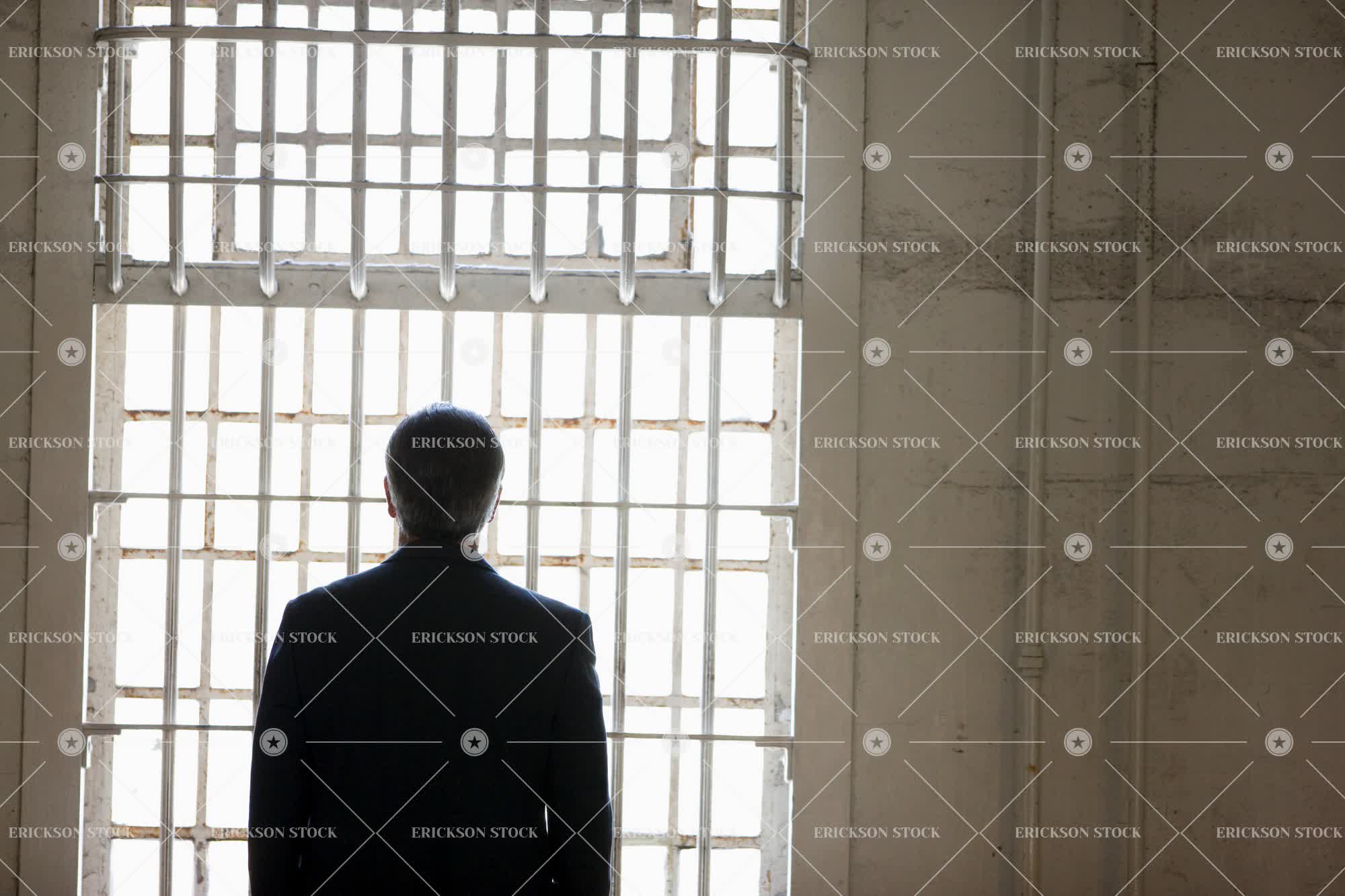 Tags back, back view, bar, business, business attire, business man, confine, crime, day, half length, horizontal, indoor, indoors, inside, jail, jail cell, jail cells, look through window, looking through window, one person, people, person, prison, prison cell, prison cells, prisoner, prisoners, punish, punished, punishment, rear, rear view, stand, standing, suit, suits, trap, trapped, waist up, white collar crime, window, windows