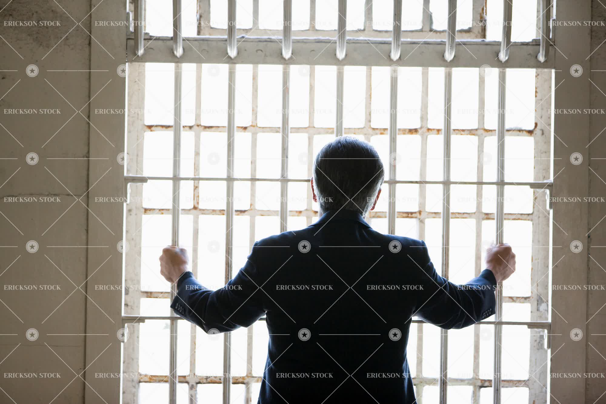 Tags back, back view, bar, business, business attire, business man, concept, confine, crime, day, grip, gripping, half length, hold, holding, horizontal, indoor, indoors, inside, jail, jail cell, jail cells, look through window, looking through window, one person, people, person, prison, prison cell, prison cells, prisoner, prisoners, punish, punished, punishment, rear, rear view, stand, standing, suit, suits, trap, trapped, waist up, white collar crime, window, windows