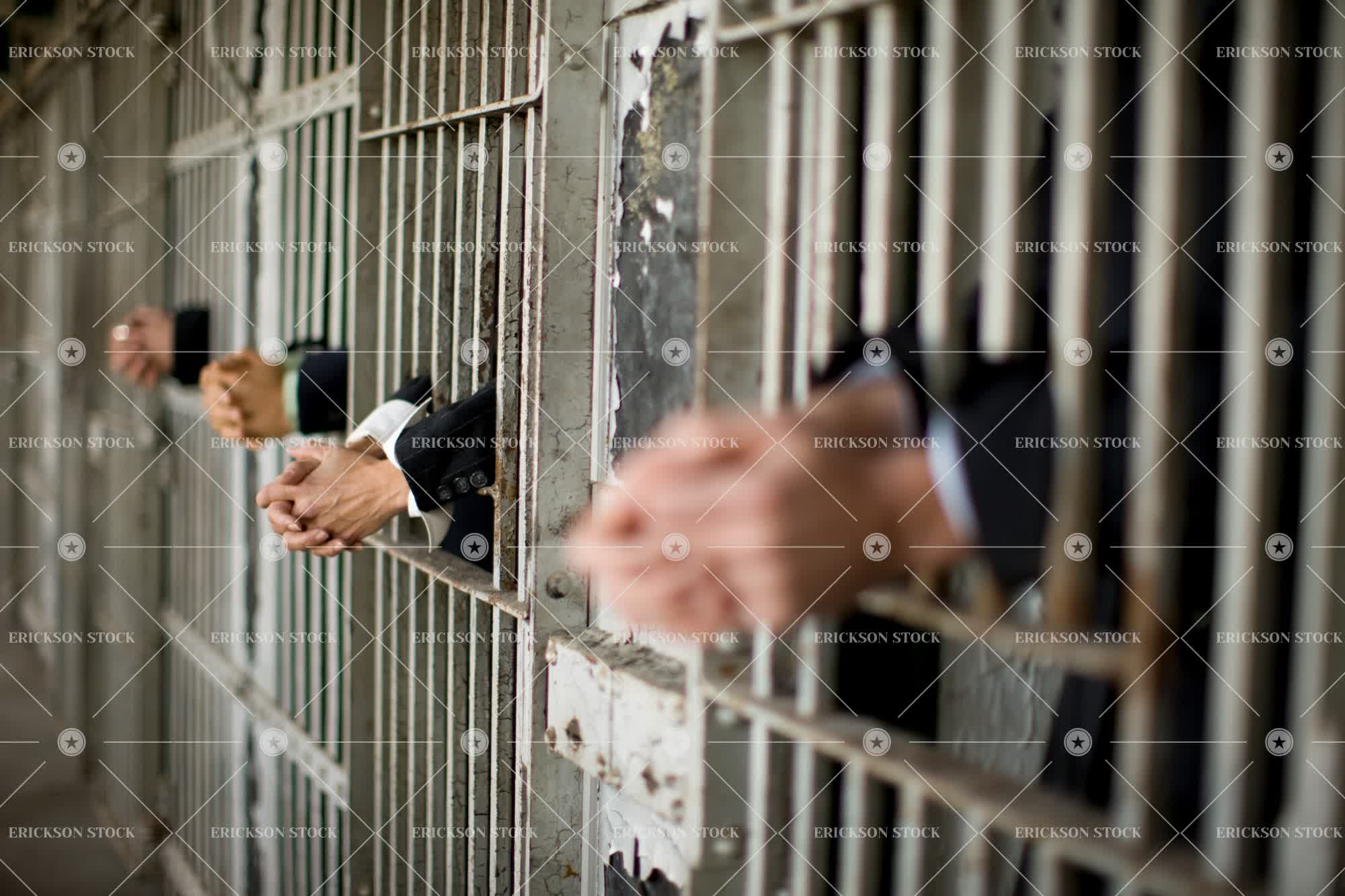 Tags bar, business, business attire, cell, cell door, confine, crime, day, door, hand, Hands, hands clasped, hands together, horizontal, human hand, human hands, indoor, indoors, inside, jail, part of, people, prison, prisoner, prisoners, punish, punished, punishment, selective focus, suit, suits, trap, trapped, white collar crime