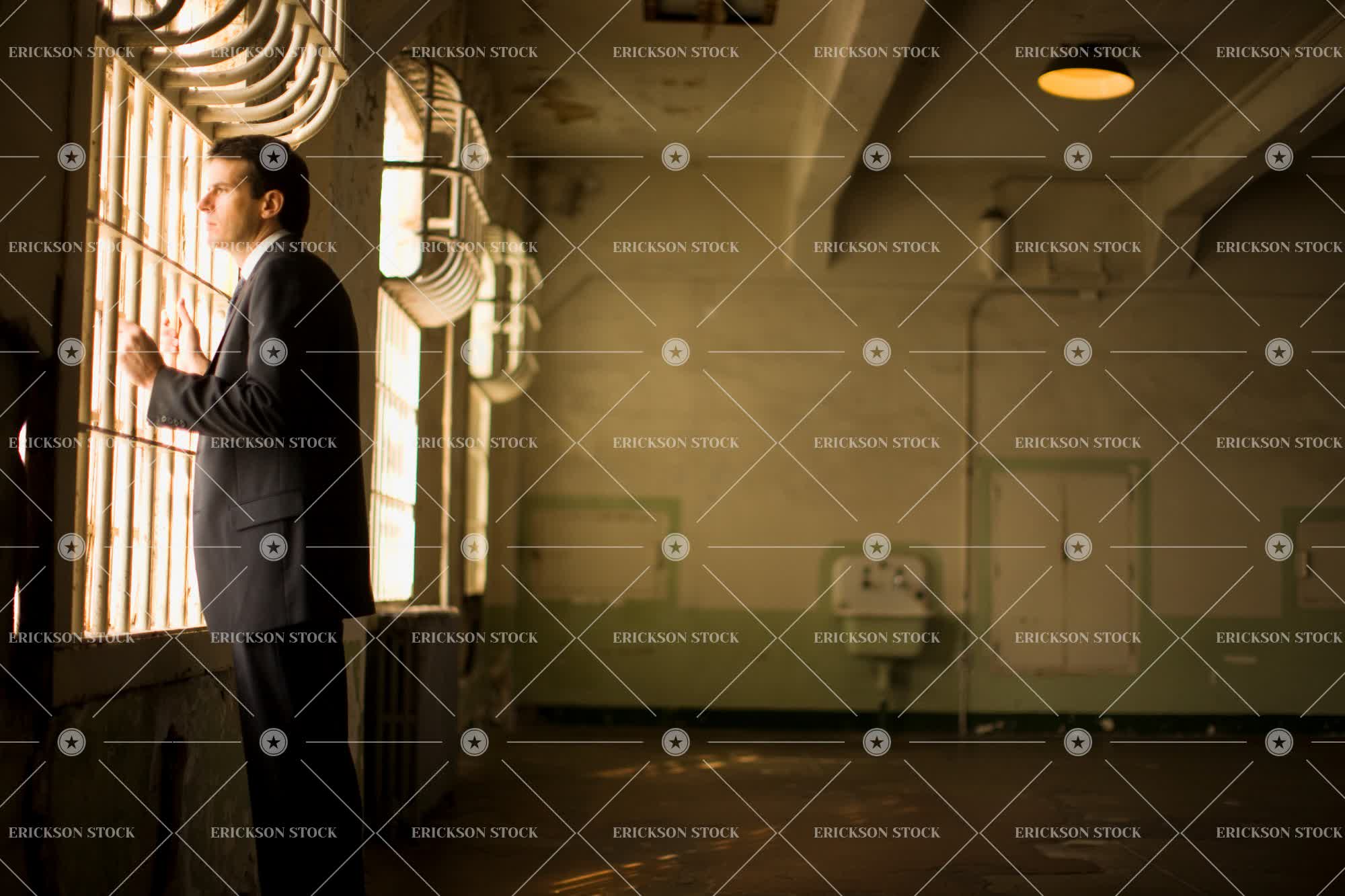 Tags adult, aged, alone, bad condition, bar, brunette, business, business attire, business man, caucasian, confine, contemplate, crime, day, decay, despair, disrepair, gloomy, grip, gripping, hold, holding, horizontal, indoor, indoors, inside, jail, jail cell, jail cells, lonely, lonesome, look through window, looking through window, male, man, melancholy, mid adult, one person, peeling paint, pensive, people, person, prison, prison cell, prison cells, prisoner, prisoners, punish, punished, punishment, sad, sadness, serious, seriously, stand, standing, suit, suits, thinking, thoughtful, three quarter length, trap, trapped, white collar crime, window, windows, young adult