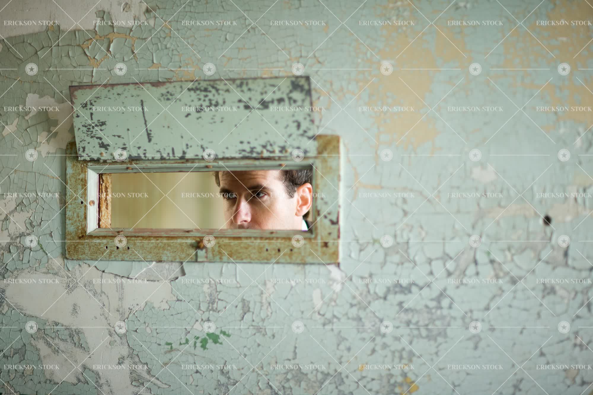 Tags adult, aged, bad condition, caucasian, cell, cell door, confine, copy space, copy space bottom, copy space right, crime, decay, disrepair, door, hatch, hatches, horizontal, human eye, human eyes, indoor, indoors, inside, jail, jail cell, jail cells, looking through an object, male, man, mid adult, negative space, negative space bottom, negative space right, one person, part of, peeling paint, peephole, peepholes, people, person, prison, prison cell, prison cells, prisoner, prisoners, punish, punished, punishment, selective focus, sliding hatch, sliding hatches, trap, trapped, white collar crime, young adult