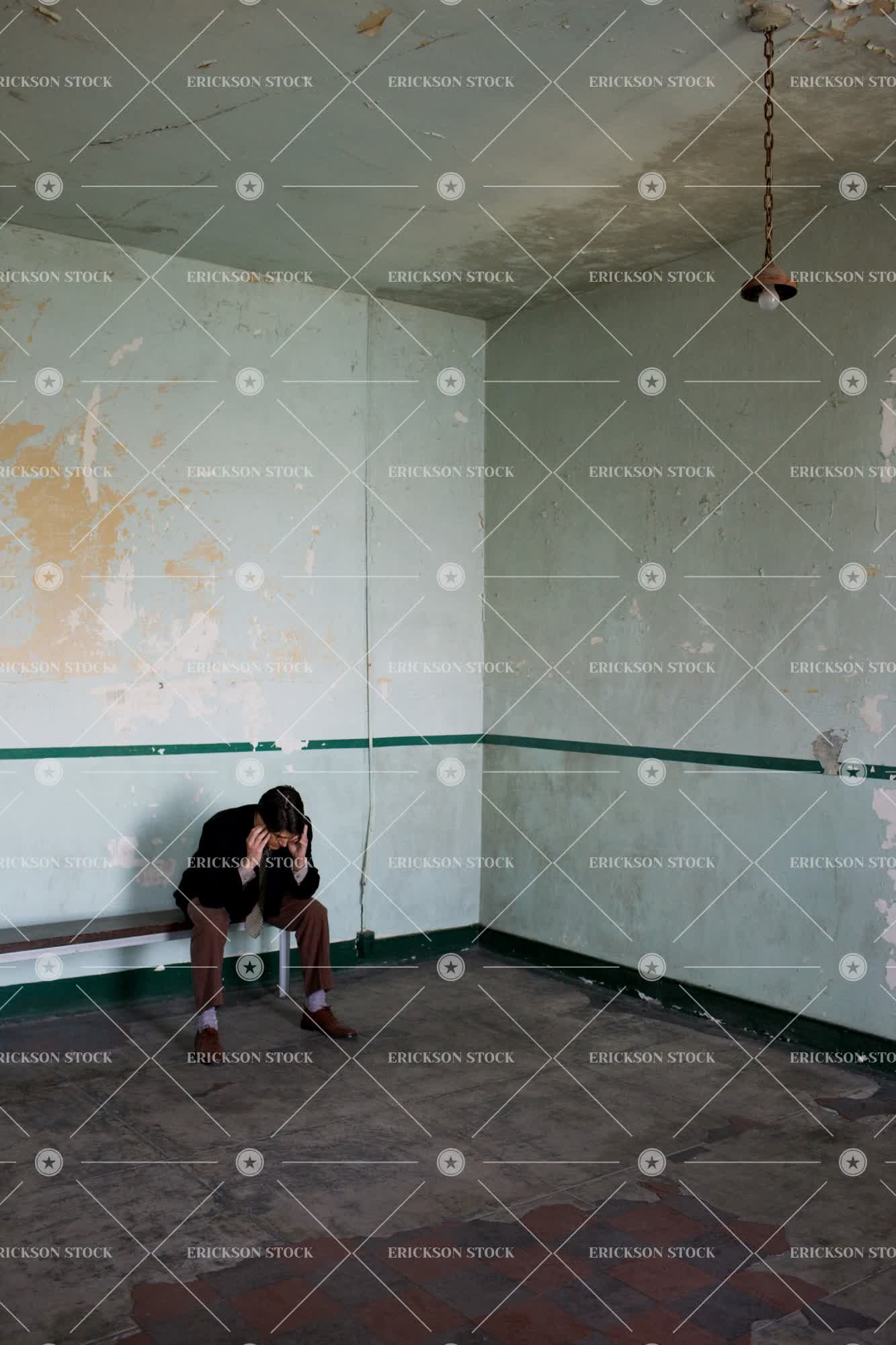 Tags adult, aged, alone, bad condition, business, business attire, business man, caucasian, confine, crime, decay, despair, disrepair, full length, gloomy, head in hand, head in hands, indoor, indoors, inside, jail, jail cell, jail cells, lonely, lonesome, male, man, melancholy, mid adult, one person, peeling paint, people, person, prison, prison cell, prison cells, prisoner, prisoners, punish, punished, punishment, sad, sadness, sit, sitting, suit, suits, trap, trapped, vertical, white collar crime, young adult