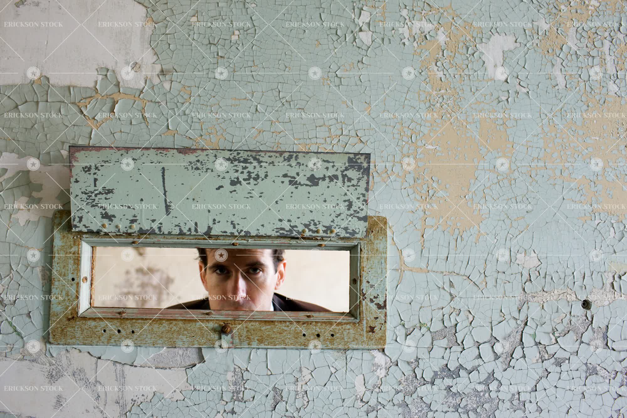 Tags adult, aged, bad condition, caucasian, cell, cell door, confine, copy space, copy space right, copy space top, crime, decay, disrepair, door, Eye contact, hatch, hatches, horizontal, human eye, human eyes, indoor, indoors, inside, jail, jail cell, jail cells, look at camera, looking at camera, looking through an object, male, man, mid adult, negative space, negative space right, negative space top, one person, part of, peeling paint, peephole, peepholes, people, person, prison, prison cell, prison cells, prisoner, prisoners, punish, punished, punishment, serious, seriously, sliding hatch, sliding hatches, stern, trap, trapped, white collar crime, young adult