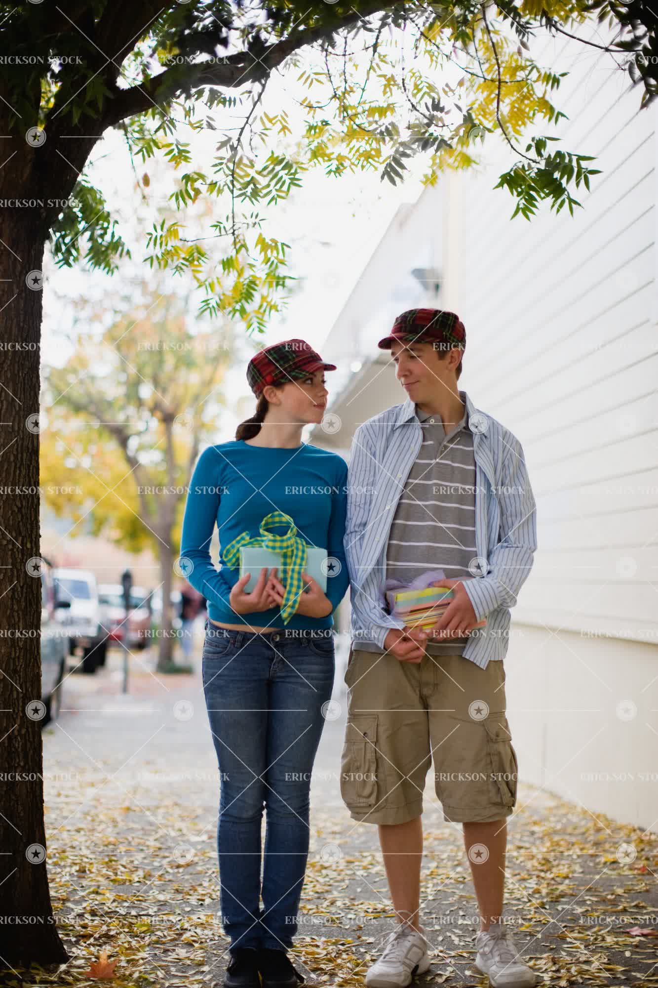 Tags bond, boy, boyfriend, cap, couple, day, female, friend, friends, friendship, front view, full length, gift, gifts, girl, girlfriend, girlfriends, girls, hat, hats, look at each other, looking at each other, love, loving, male, next to, outdoor, outdoors, outside, people, plaid, present, presents, relationship, relationships, road, roads, romance, romantic, selective focus, side by side, street, streets, teenage boy, teenage girl, teenager, together, togetherness, Tree, trees, two people, vertical, Walking, young adult