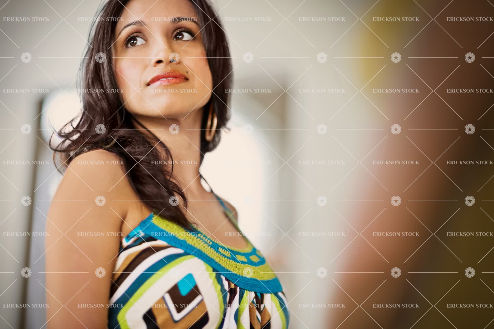 Tags adult, beautiful, brunette, calm, casual clothes, classic, contemplate, copy space, copy space right, day, face, Faces, female, half length, horizontal, indoor, indoors, inside, latin american, look away, looking away, mid adult, negative space, negative space right, one person, pensive, people, person, portrait, Portraits, serious, seriously, stand, standing, subject left, thinking, thoughtful, waist up, woman, young adult