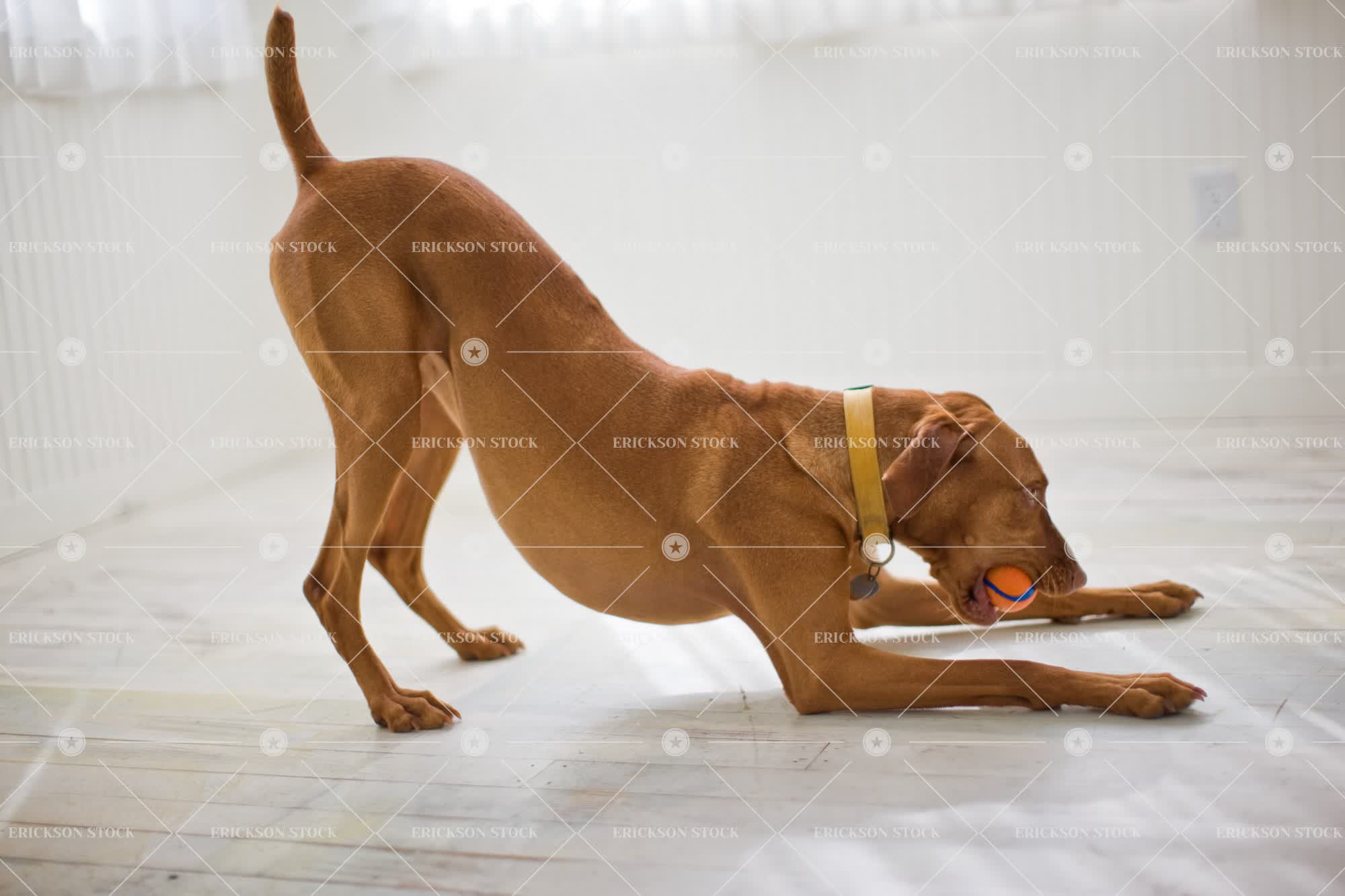 Brown dog holding a ball in it’s mouth inside a bare room.