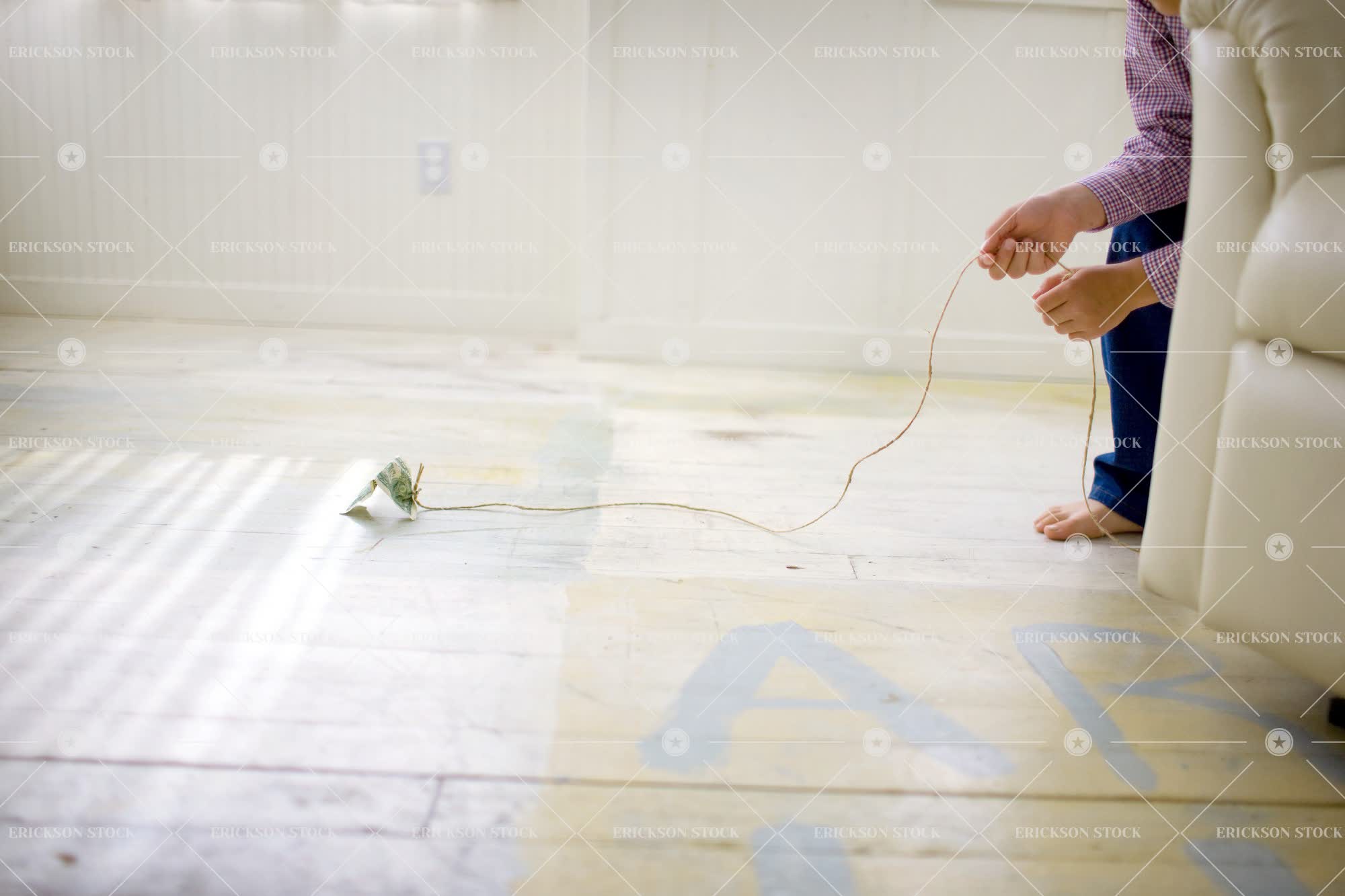 Child hiding behind a chair holding onto string with paper money attached to it.