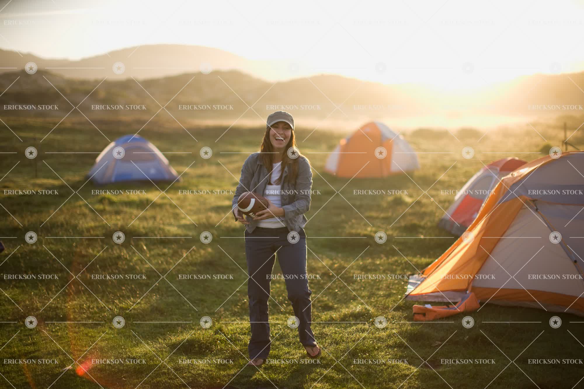 Portrait of a laughing young woman throwing a football in a campsite at sunset.