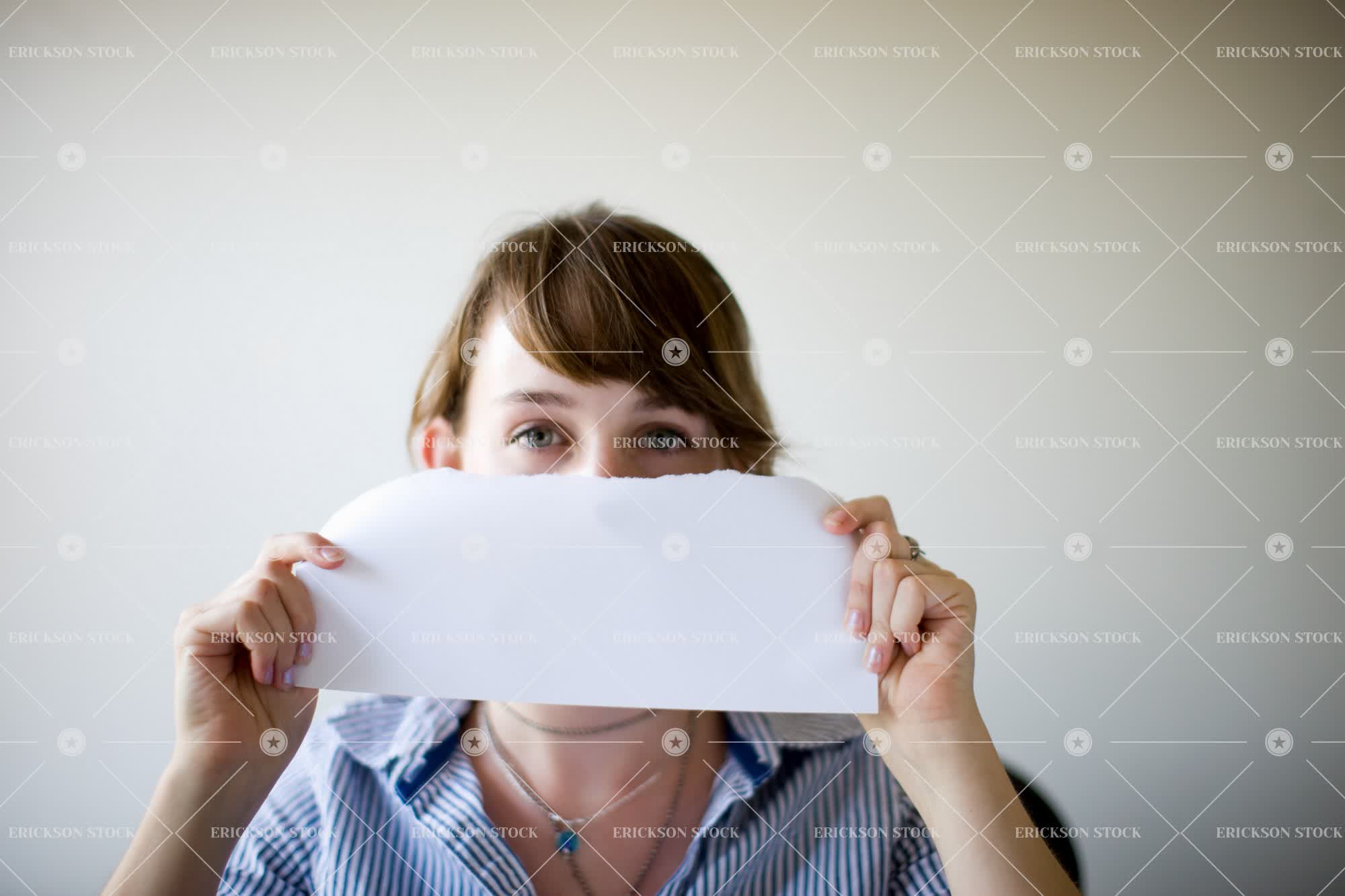 Tags adult, button down shirt, calm, caucasian, collared shirt, copy space, copy space right, day, destruction, Eye contact, face obscured, female, frame, framed, front view, head, head & shoulders, head and shoulders, head shot, headshot, horizontal, indoor, indoors, inside, look at camera, looking at camera, mystery, negative space, negative space right, obscured face, one person, paper, people, person, rip, ripped, ripping, serious, seriously, sheet, sheet of paper, shirt, shirts, shoulders, sitting, stern, subject left, tear, tearing, teenager, torn, vignette, young adult