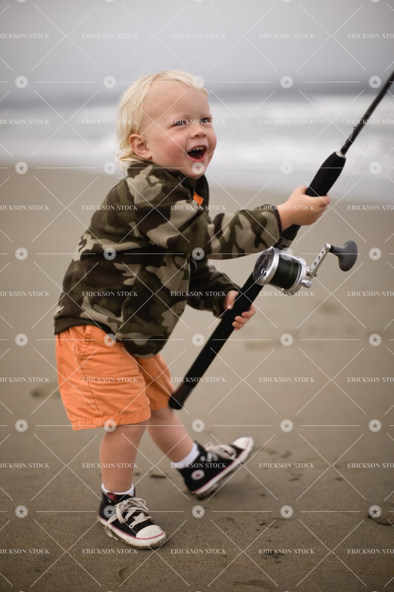 Happy young toddler holding a fishing rod while standing on a remote sandy beach.