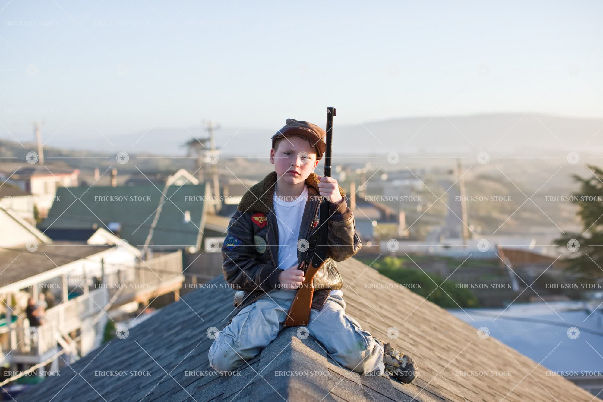 Tags attitude, boy, building, child, day, elementary age, Eye contact, full length, home, homes, horizontal, house, house exterior, house exteriors, household, households, houses, Imagination, imagining, kid, kids, look at camera, looking at camera, make believe, male, Mischief, mischievous, one person, outdoor, outdoors, outside, people, person, play, Playful, Playing, pre-adolescent, pre-adolescents, Pre-teen, pre-teens, preteen, preteens, pretend, Pretending, residence, residences, residential district, residential districts, rooftop, rooftops, selective focus, serious, seriously, sit, sitting, toy gun, toy guns, toy rifle, toy rifles, tween