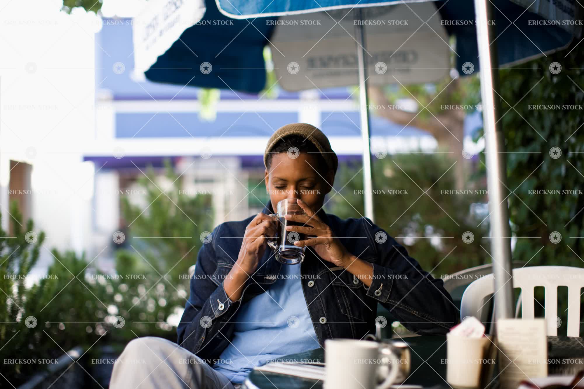Tags adult, african american, beanie, cafe, day, denim, denim jacket, drink, drinking glass, enjoyment, female, Food and drink, glass, glasses, hat, hats, horizontal, knit hat, knitted hat, mid adult, one person, outdoor, outdoors, outside, people, person, selective focus, sit, sitting, sun shade, sun shades, sun umbrella, sun umbrellas, sunshade, sunshades, table, Tables, three quarter length, woman, young adult