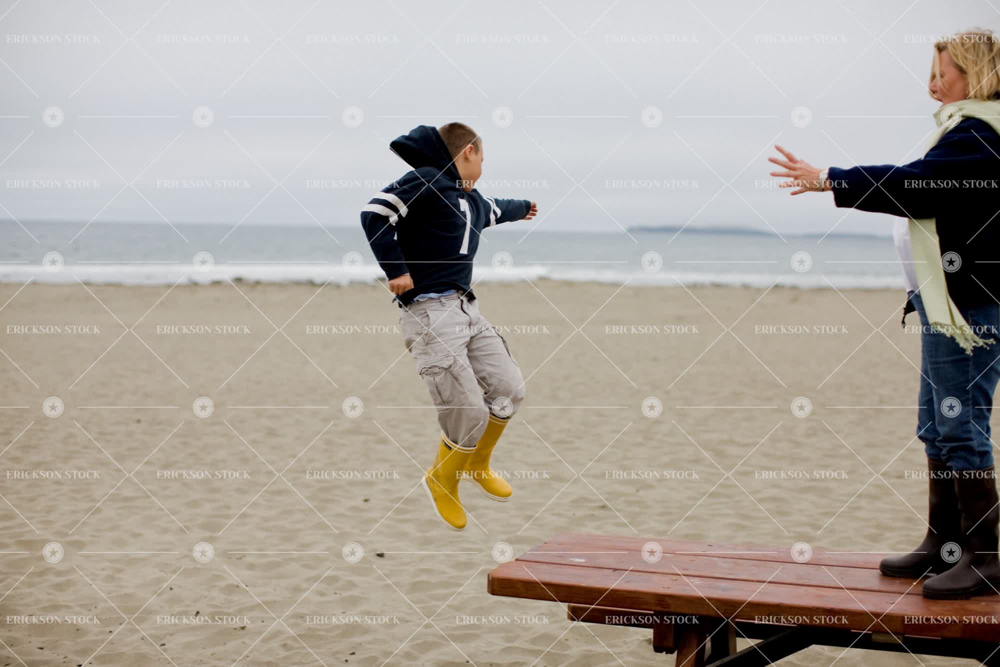Mid-adult woman and her son playing on a wooden picnic table on a beach.