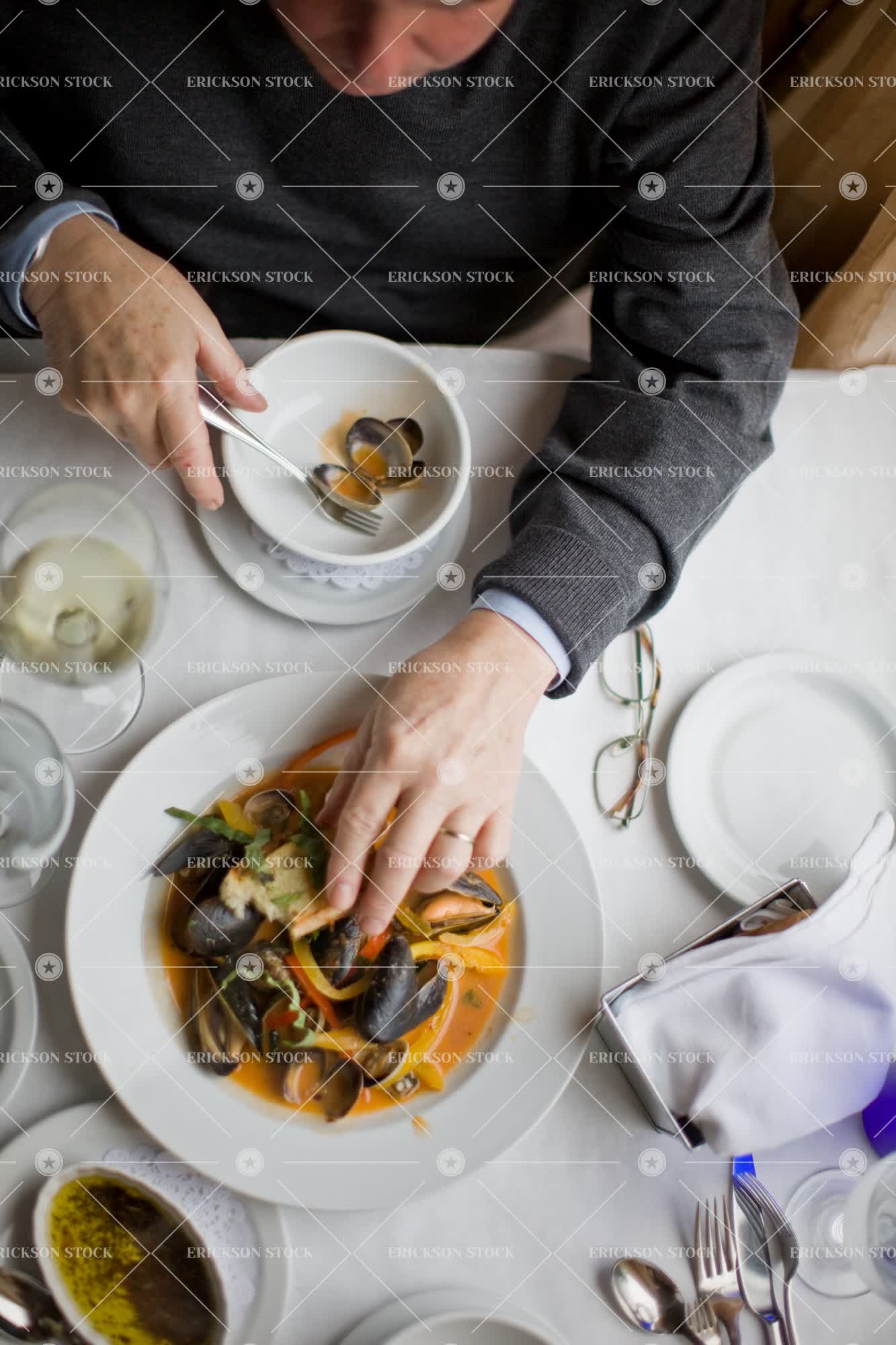 Tags adult, casual clothes, chowder, eateries, eatery, eating, Food, Food and drink, head, head & shoulders, head and shoulders, head shot, headshot, high angle, high angle view, indoor, indoors, inside, male, man, meal, meals, mussel, mussels, one person, person, Restaurant, restaurants, seafood, seafood chowder, selective focus, shellfish, shoulders, sit, sitting, soup, soups, vertical