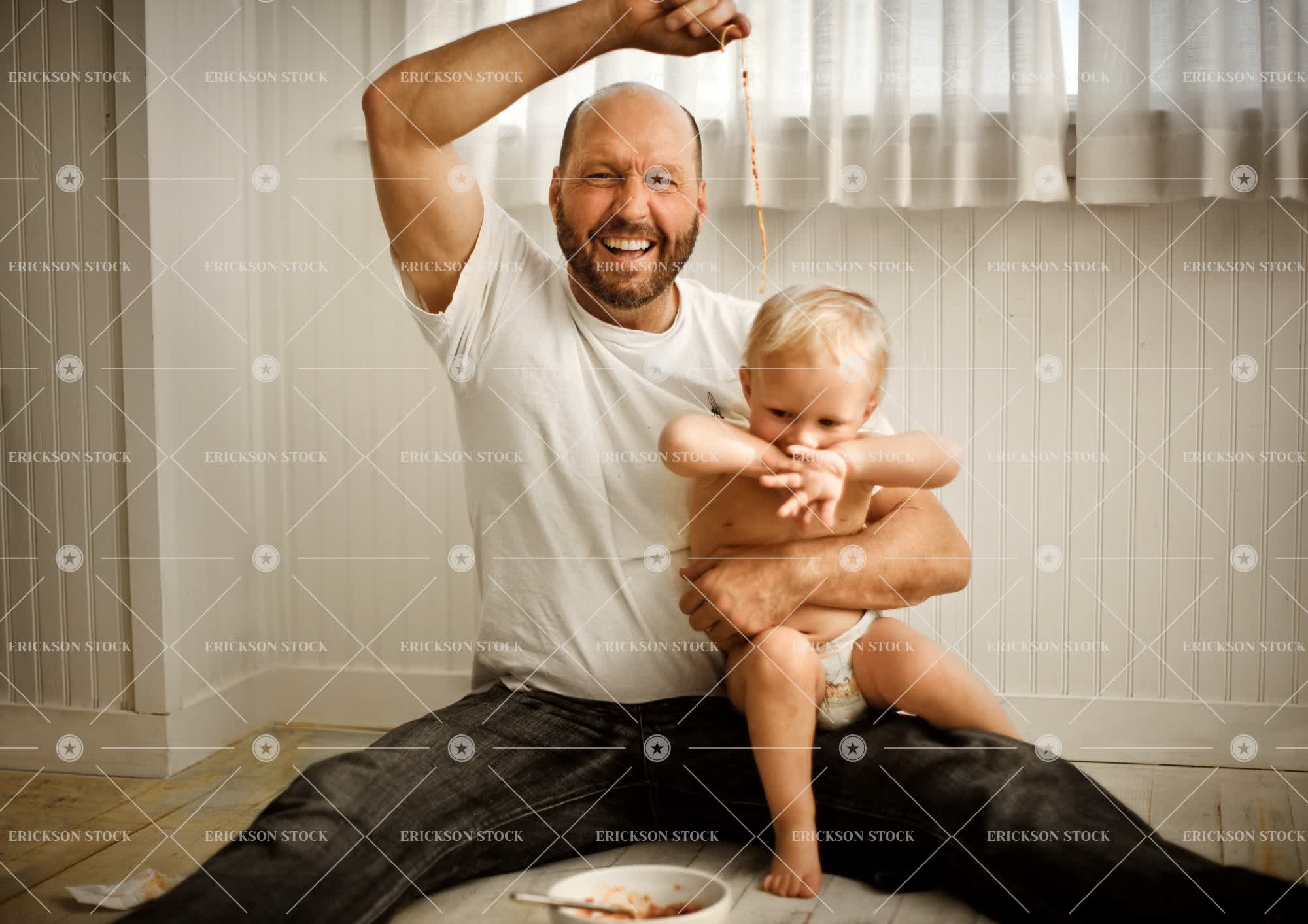 Tags adorable, adult, arm raised, baby, baby boy, bald, bare chested, beard, blond, blue jeans, bond, bowl, boy, casual clothes, caucasian, cheerful, child, Cute, dangle, delight, denim, diaper, dinner, dish, enjoyment, Eye contact, facial hair, family, father, floorboard, floorboards, flooring, Food, Food and drink, food fight, food fighting, full length, Fun, grin, grinning, grins, hand raised, hands raised, happiness, happy, hardwood floor, having fun, hold, holding, holds, home, home interior, home interiors, homes, horizontal, house, house interior, house interiors, houses, interior, interiors, jeans, joy, joyful, kid, kids, leisure, leisure activities, leisure activity, look at camera, looking at camera, male, man, meal, meals, mess, messy, messy food, mid adult, Mischief, mischievous, nappies, nappy, parent, parents, people, person, Playful, Playing, portrait, Portraits, preschool age, preschooler, preschoolers, recreation, recreational pursuit, recreational pursuits, selective focus, semi dress, shaved head, shirtless, short hair, sit, sitting, smile, smiling, son, spaghetti, t-shirt, t-shirts, tee shirt, tee shirts, three quarter length, throwing, throwing food, toddler, toothy smile, towhead, two people, wood, wooden