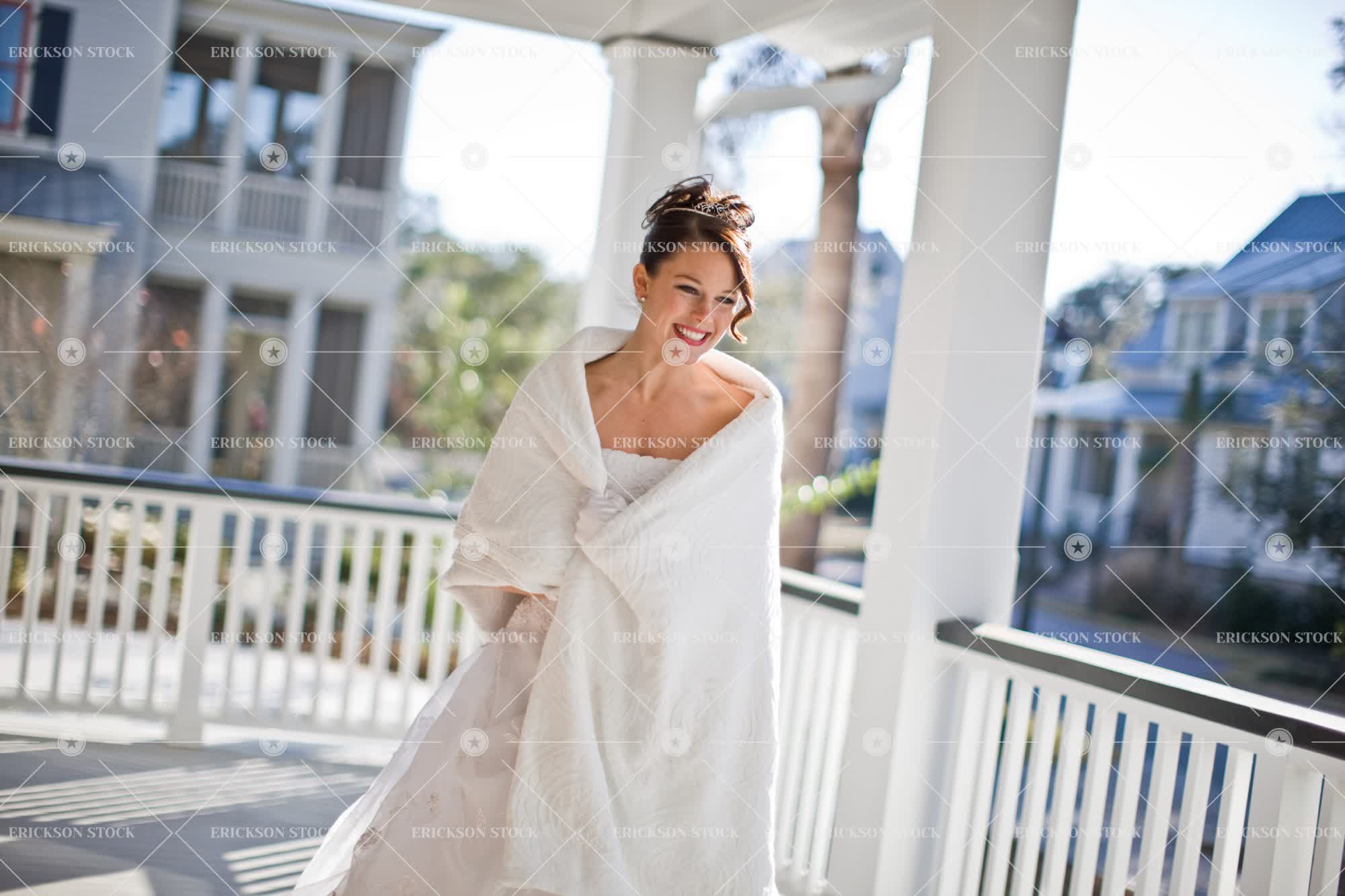 Tags adult, begin, bride, brunette, canted angle, caucasian, celebrate, day, deck, dress, female, hair back, happiness, happy, horizontal, life event, life events, marriage, mid adult, oblique angle, one person, outdoor, outdoors, outside, palmetto, person, porch, porches, selective focus, shawl, shawls, smile, smiling, three quarter length, tilt, tilted angle, veranda, verandah, verandahs, verandas, wedding, wedding dress, wedding dresses, weddings, woman, young adult