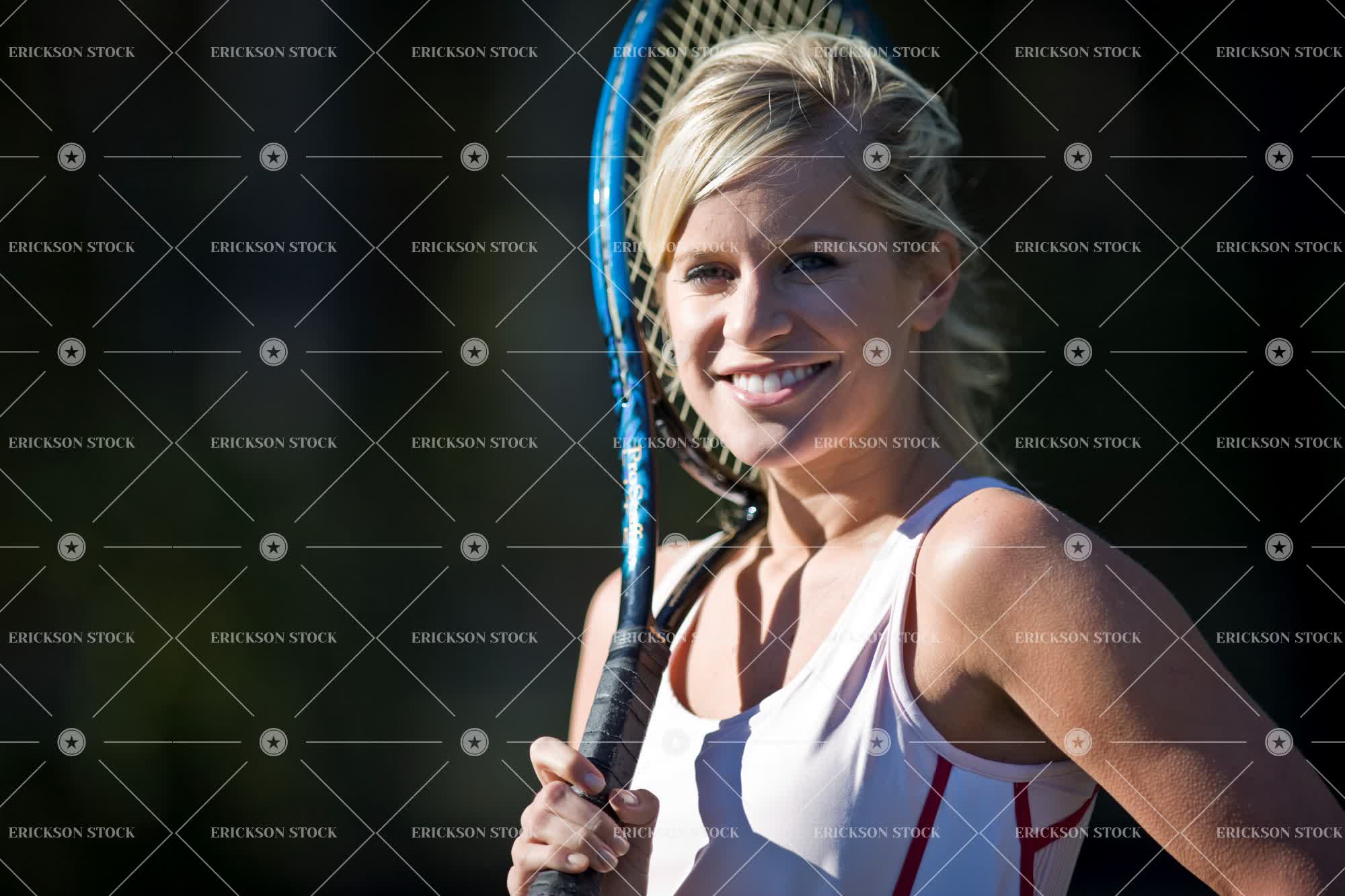 Tags adult, blond, caucasian, copy space, copy space left, day, Eye contact, female, hair tied up, happiness, happy, head, head & shoulders, head and shoulders, head shot, headshot, hold, holding, horizontal, leisure, leisure activities, leisure activity, look at camera, looking at camera, negative space, negative space left, one person, outdoor, outdoors, outside, palmetto, person, ponytail, portrait, Portraits, racket, rackets, recreation, recreational pursuit, recreational pursuits, selective focus, shoulders, smile, smiling, sport, Sports, sports clothing, sportswear, tennis, tennis racket, tennis rackets, tennis racquet, tennis racquets, woman, young adult