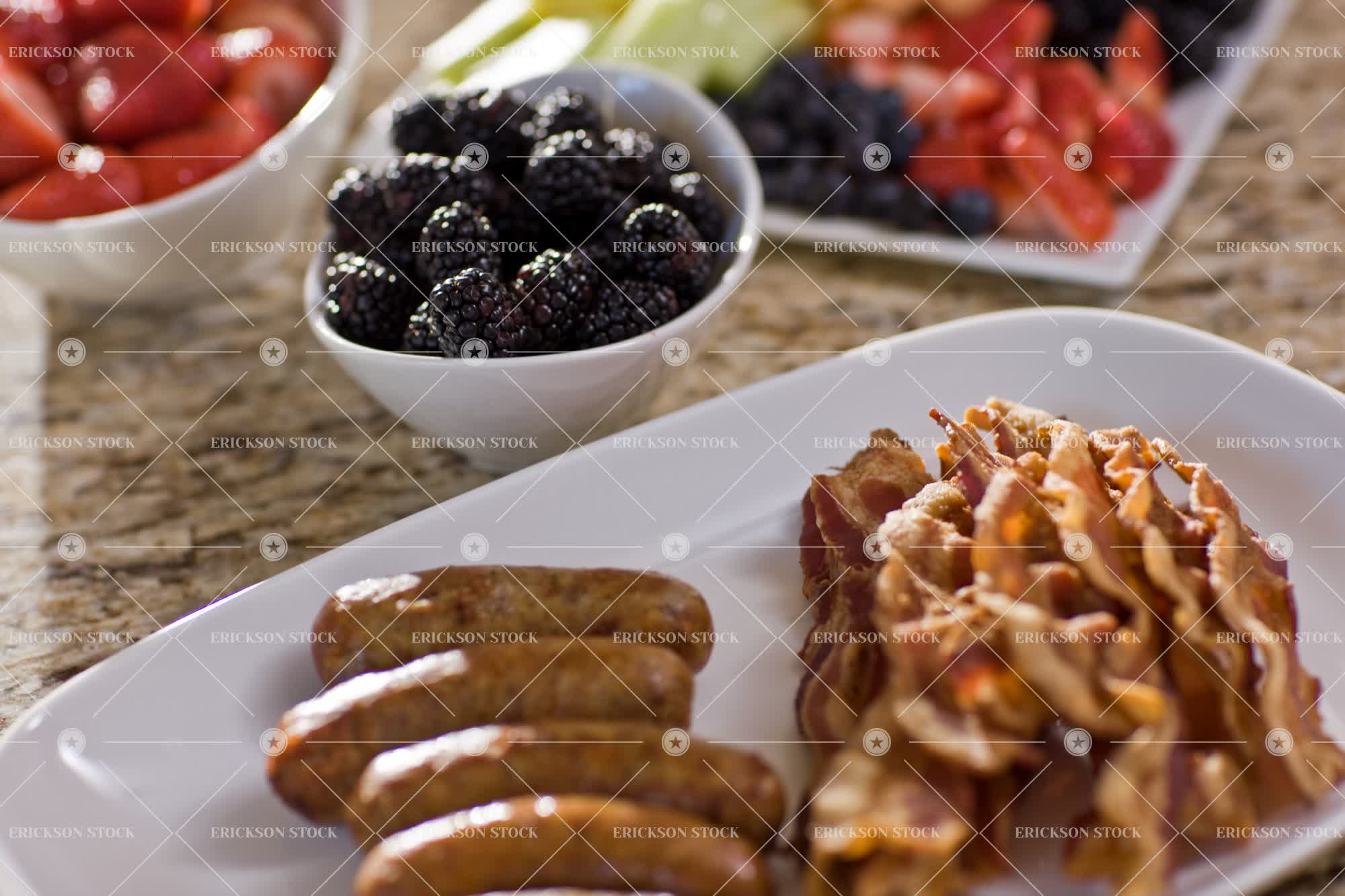 Tags assortment, bacon, berry, blackberry, breakfast, counter, Food, Food and drink, fresh, freshness, fruit, fruits, healthy, healthy eating, healthy food, horizontal, indoor, indoors, inside, Kitchen, kitchen counter, morning, nobody, palmetto, sausage, sausages, selective focus, variation, variety