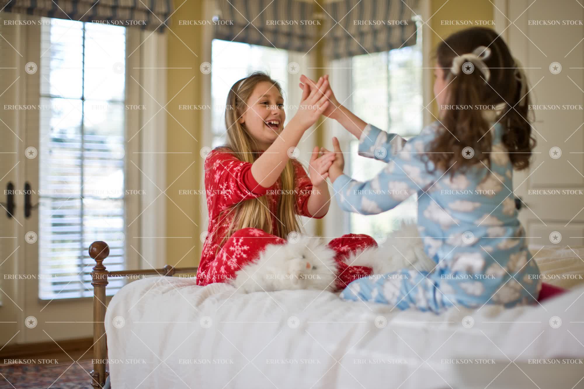 Tags bed, bedroom, caucasian, child, day, elementary age, enjoyment, family, female, friend, friends, friendship, full length, Fun, girl, girls, happiness, happy, having fun, home interior, home interiors, horizontal, indoor, indoors, inside, kid, kids, Pajamas, palmetto, patty cake, person, play, Playful, Playing, pre-adolescent, pre-adolescents, Pre-teen, pre-teens, preteen, preteens, pyjama, pyjamas, selective focus, sibling, siblings, sister, sisters, sleepover, sleepovers, Sleepwear, slumber parties, slumber party, smile, smiling, together, togetherness, tween, two people