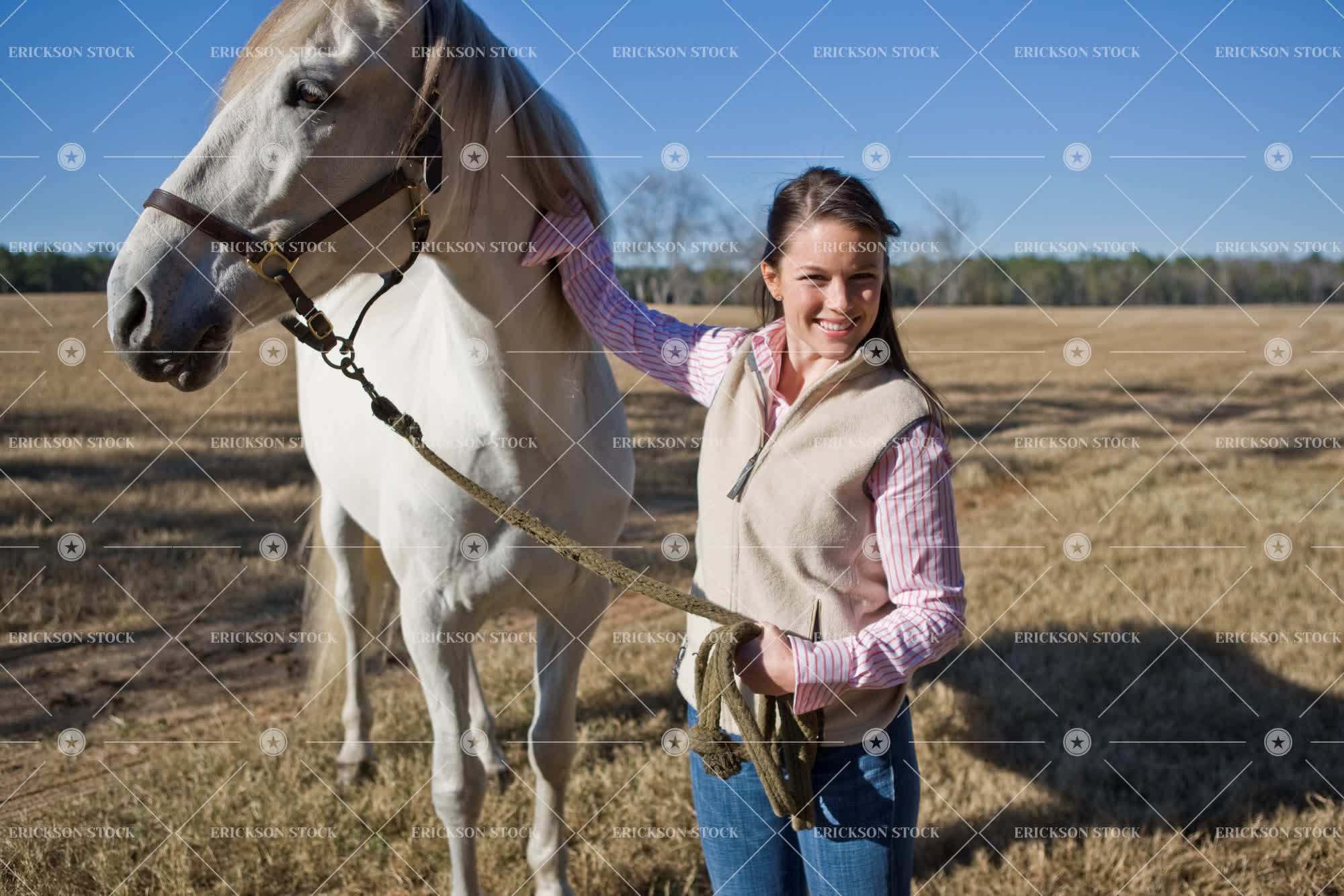 Tags adult, affectionate, animal, brunette, caucasian, clear sky, country, countryside, day, equines, Eye contact, female, field, fields, focus on foreground, happiness, happy, herbivore, herbivores, herbivorous, hold, holding, hoof, hoofed, hoofed animal, hoofed animals, horizontal, horse, horse riders, horse riding, horseback riding, horses, leisure, leisure activities, leisure activity, long hair, look at camera, looking at camera, love, loving, Mammal, mammals, mid adult, one animal, one person, outdoor, outdoors, outside, paddock, paddocks, palmetto, patting, person, petting, recreation, recreational pursuit, recreational pursuits, ride, rider, riders, rides, riding, rope, ropes, rural, selective focus, smile, smiling, stroke, strokes, stroking, three quarter length, Touching, woman, young adult