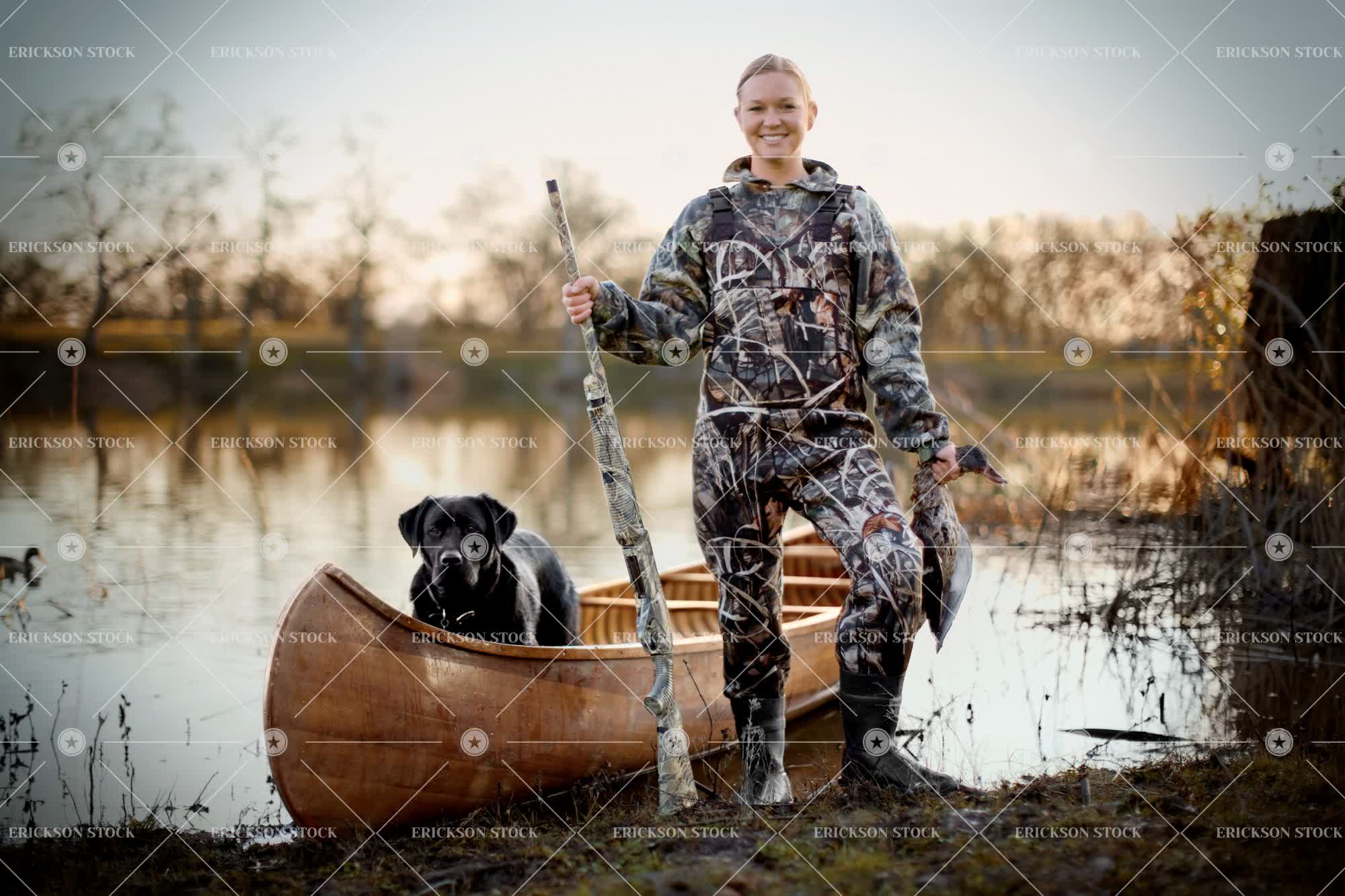 Young adult woman duck shooting with her dog and a canoe by a lake.