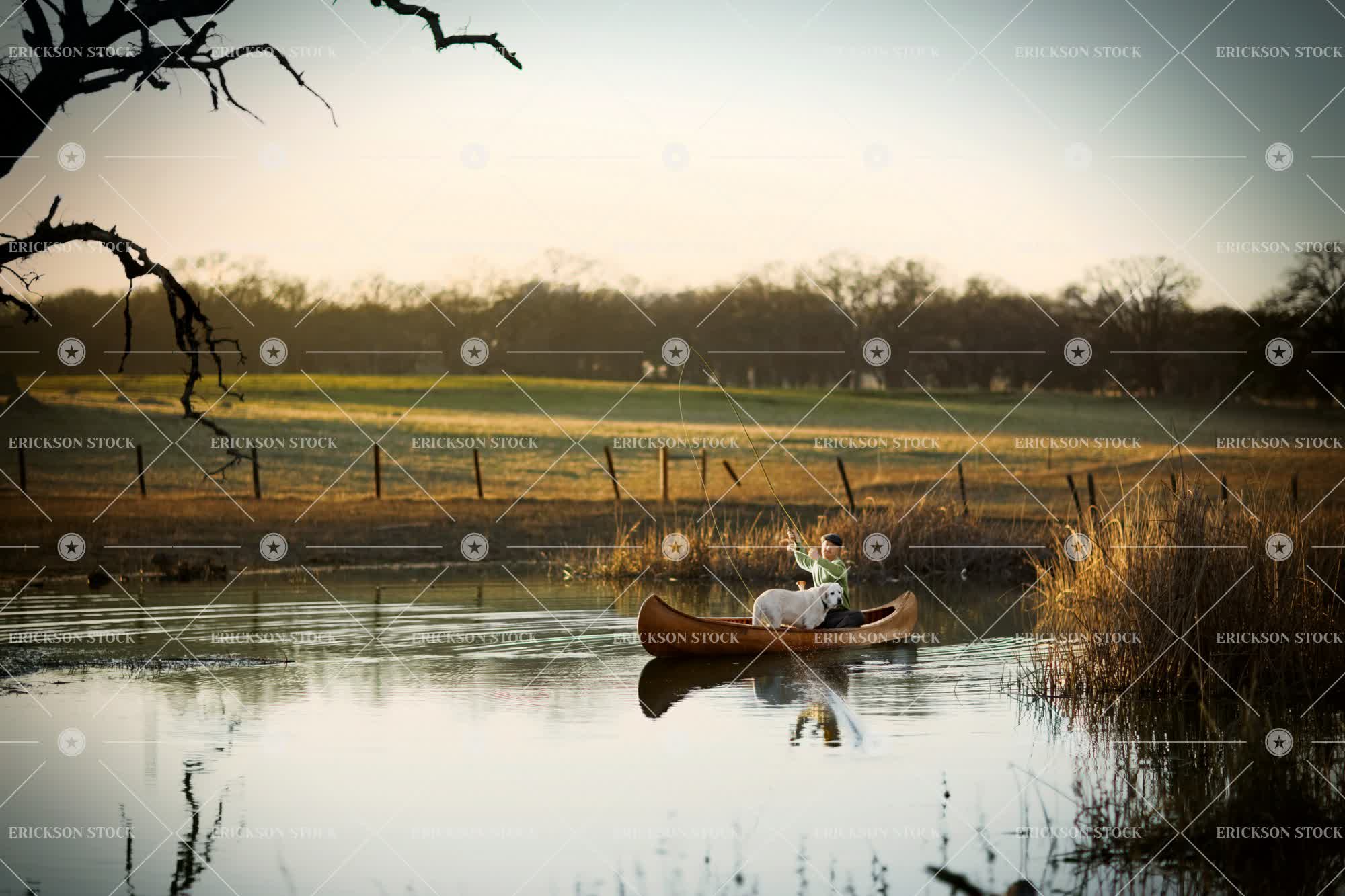 Young adult man fishing in a canoe with his dog on a lake.