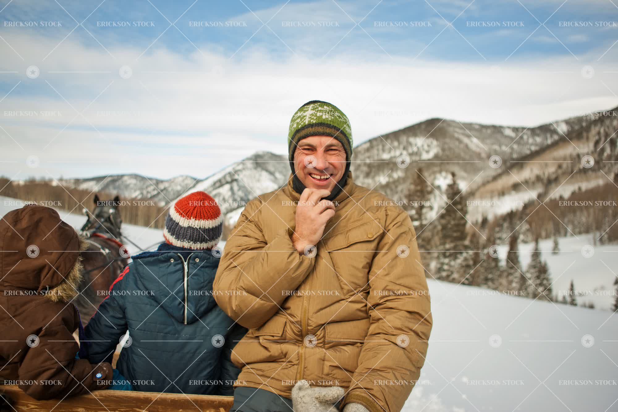Portrait of a smiling mid adult man having fun with his two young sons while riding in a horsedrawn cart through the snow.