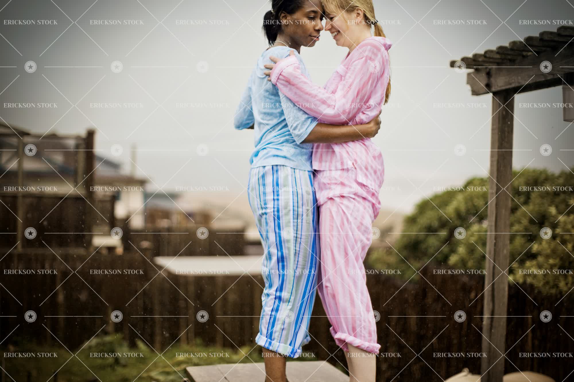 Tags adult, affectionate, african american, arm around, backyard, bench, caucasian, cheerful, choose, close, copy space, copy space left, couple, day, embrace, embracing, female, females only, Fence, fenced, fences, frame, framed, garden, gardens, gay, gay couple, gay couples, grass, grin, grinning, happiness, happy, homosexual couple, homosexual couples, horizontal, hug, hugging, lawn, lawns, lesbian, lesbian couple, lesbian couples, lesbians, mid adult, negative space, negative space left, non-conformity, only females, only women, outdoor, outdoors, outside, pajama, Pajamas, people, profile, relationship, relationships, Side view, Sleepwear, smile, smiles, smiling, stand, standing, subject right, three quarter length, two people, vignette, woman, young adult