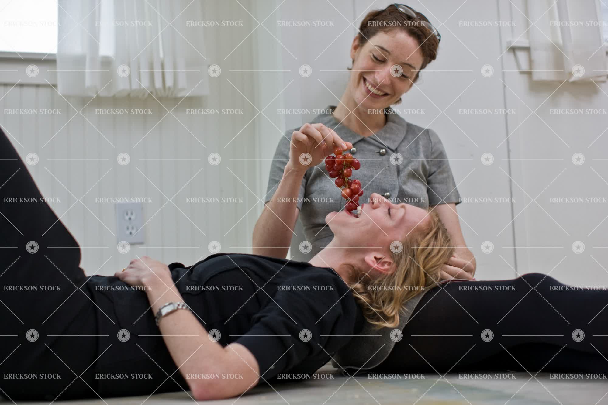 Women lying on floor of house eating grapes