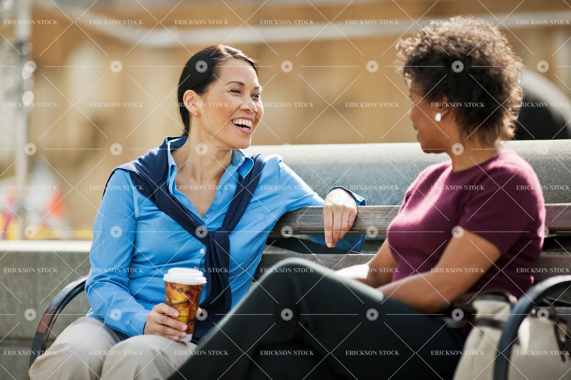 Tags adult, african american, asian, blouse, bond, button down shirt, casual clothes, cheerful, city, coffee, coffee cup, collared shirt, conversation, copy space, curl, day, delight, disposable cup, drink, enjoyment, face to face, facing each other, female, Food and drink, Fun, garden, gardens, grin, grinning, grins, hair tied up, happiness, happy, having fun, hold, holding, holds, horizontal, joy, joyful, laughing, leisure, leisure activities, leisure activity, looking at each other, mid adult, mixed race, mixed race person, negative space, next to, outdoor, outdoors, outside, Park, parks, people, person, ponytail, public park, public parks, public space, public spaces, recreation, recreational pursuit, recreational pursuits, ringlet, ringlets, selective focus, shirt, shirts, side by side, sit, sitting, smile, smiling, speak, speaking, speaks, t-shirt, t-shirts, talk, talking, talks, tee shirt, tee shirts, three quarter length, together, togetherness, toothy smile, top, two people, urban, urban scene, woman