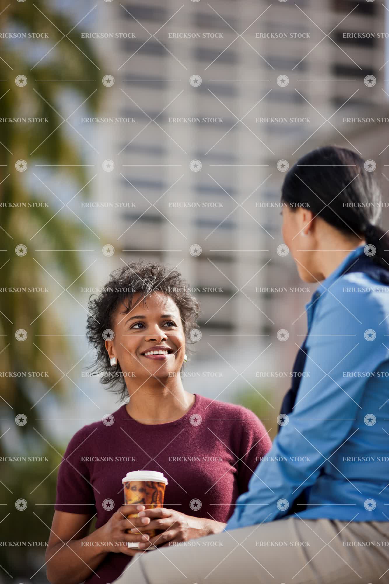 Tags adult, african american, asian, black hair, bond, brunette, casual clothes, cheerful, city, coffee, coffee cup, colleague, conversation, curl, day, delight, drink, enjoyment, female, Food and drink, friend, friends, friendship, Fun, hair tied up, half length, happiness, happy, having fun, joy, joyful, leisure, leisure activities, leisure activity, mature adult, mid adult, mixed race, mixed race person, outdoor, outdoors, outside, people, person, ponytail, recreation, recreational pursuit, recreational pursuits, ringlet, ringlets, road, roads, selective focus, sit, sitting, smile, smiling, speak, speaking, speaks, street, streets, t-shirt, t-shirts, take a break, taking a break, talk, talking, talks, tee shirt, tee shirts, together, togetherness, two people, urban, urban scene, Urban scenes, vertical, waist up, woman, young adult
