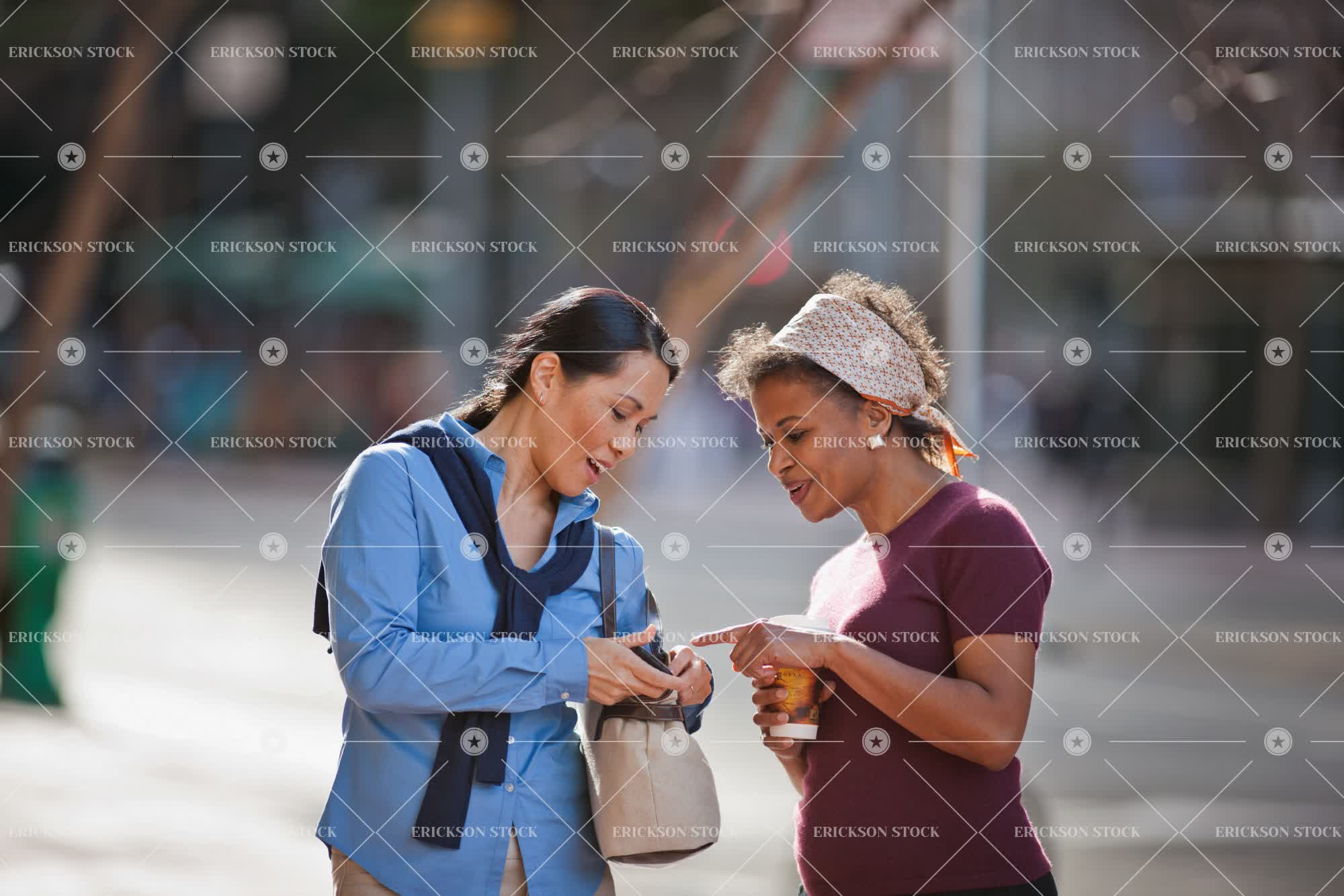 Tags adult, african american, asian, black hair, bond, brunette, button down shirt, casual clothes, cell phone, cheerful, city, coffee, coffee cup, collared shirt, colleague, conversation, curl, day, delight, drink, enjoyment, female, Food and drink, friend, friends, friendship, Fun, hair tied up, half length, happiness, happy, having fun, headscarf, headscarves, horizontal, joy, joyful, leisure, leisure activities, leisure activity, mature adult, mid adult, mixed race, mixed race person, mobile, mobile phone, mobile phones, mobiles, outdoor, outdoors, outside, people, person, phone, phones, point, pointing, points, ponytail, recreation, recreational pursuit, recreational pursuits, ringlet, ringlets, road, roads, scarf, scarves, selective focus, shirt, shirts, smile, smiling, speak, speaking, speaks, street, streets, t-shirt, t-shirts, take a break, taking a break, talk, talking, talks, tee shirt, tee shirts, together, togetherness, two people, urban, urban scene, Urban scenes, waist up, woman, young adult