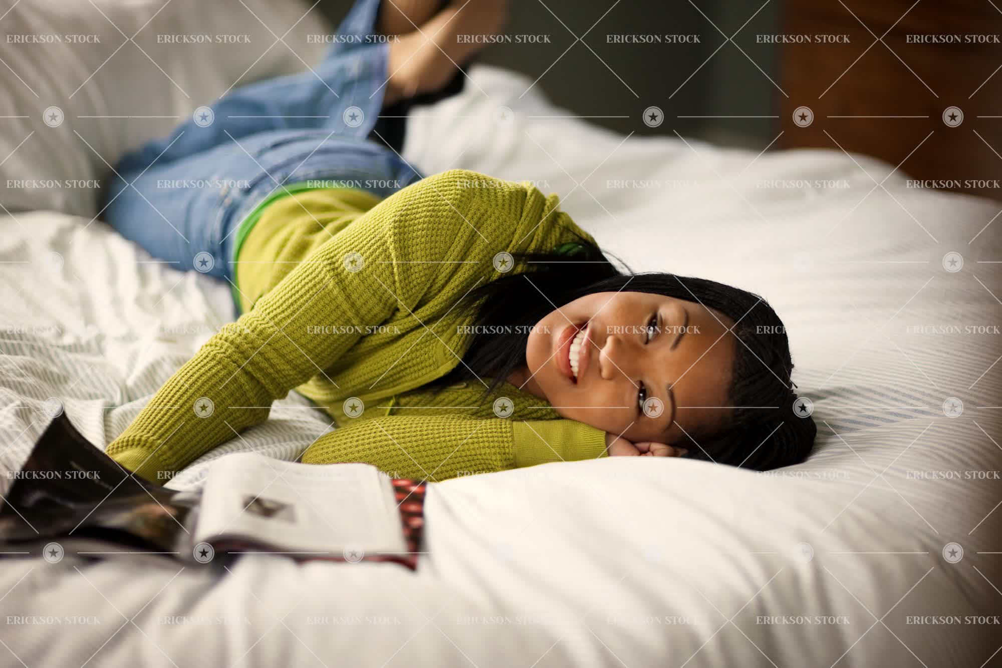 Tags adult, african american, bed, bedroom, black hair, brunette, casual clothes, cheerful, delight, enjoyment, female, full length, Fun, girl, girls, happiness, happy, having fun, home, home interior, home interiors, homes, hood, hooded, hooded shirt, hooded shirts, hoodie, hoodies, horizontal, house, house interior, house interiors, houses, indoor, indoors, inside, interior, interiors, joy, joyful, leisure, leisure activities, leisure activity, lie down, lie on front, long hair, look up, looking up, Lying down, lying on front, magazine, magazines, one person, people, person, read, reading, recreation, recreational pursuit, recreational pursuits, relax, Relaxation, relaxed, relaxes, relaxing, selective focus, smile, smiling, sweatshirt, sweatshirts, teenage girl, teenager, weekend activities, weekend activity, woman, young adult