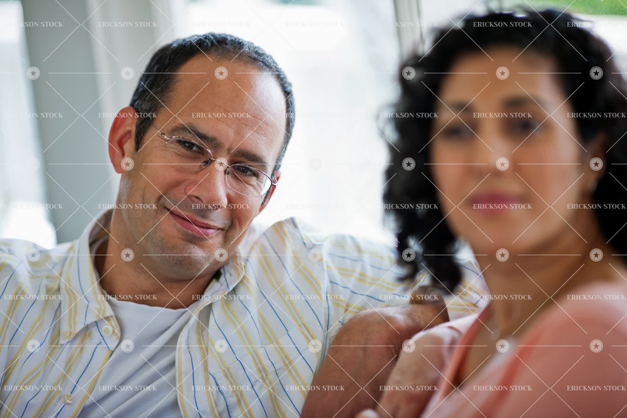 Portrait of a mid adult man sitting next to his girlfriend.