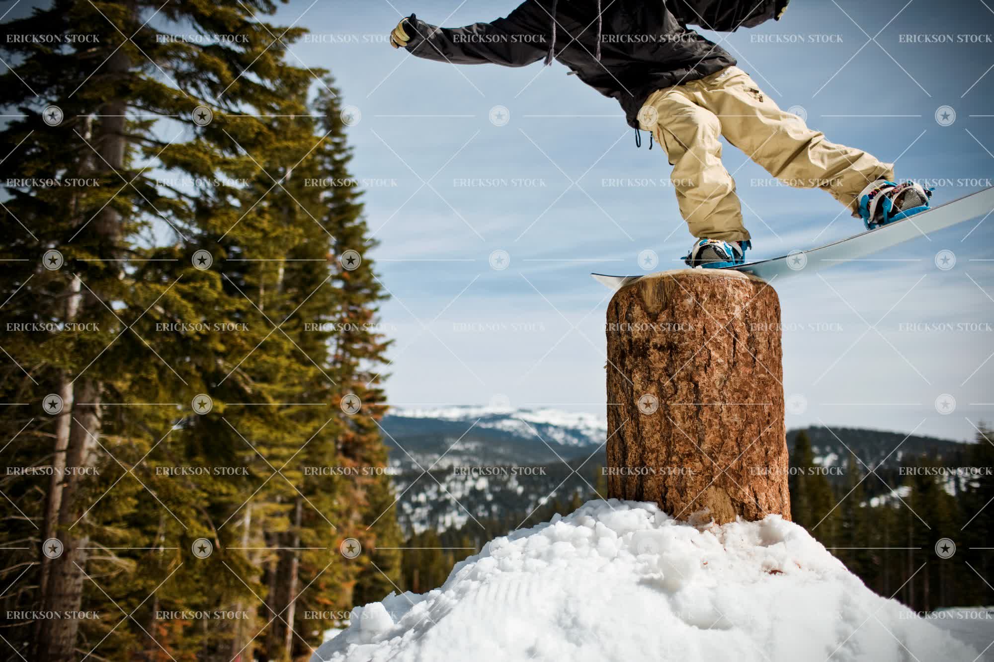 Tags active, adventure, agile, balance, cold, cropped, day, extreme sport, Extreme sports, forest, Fun, horizontal, legs, leisure, leisure activity, low section, mountain, mountain range, mountain ranges, mountains, natural, nature, on top of, one person, outdoor, outdoors, outside, part of, people, person, recreation, recreational pursuit, selective focus, ski resort, ski resorts, ski slope, ski slopes, ski wear, Skill, skills, snow, snowboard, snowboarder, snowboarders, snowboarding, snowboards, snowing, sport, Sports, stand, standing, stump, stunt, stunts, Tree, tree stump, tree stumps, tree trunk, tree trunks, trees, tricks, unrecognizable people, unrecognizable person, warm clothes, warm clothing, winter, winter sport, winter sports, woods