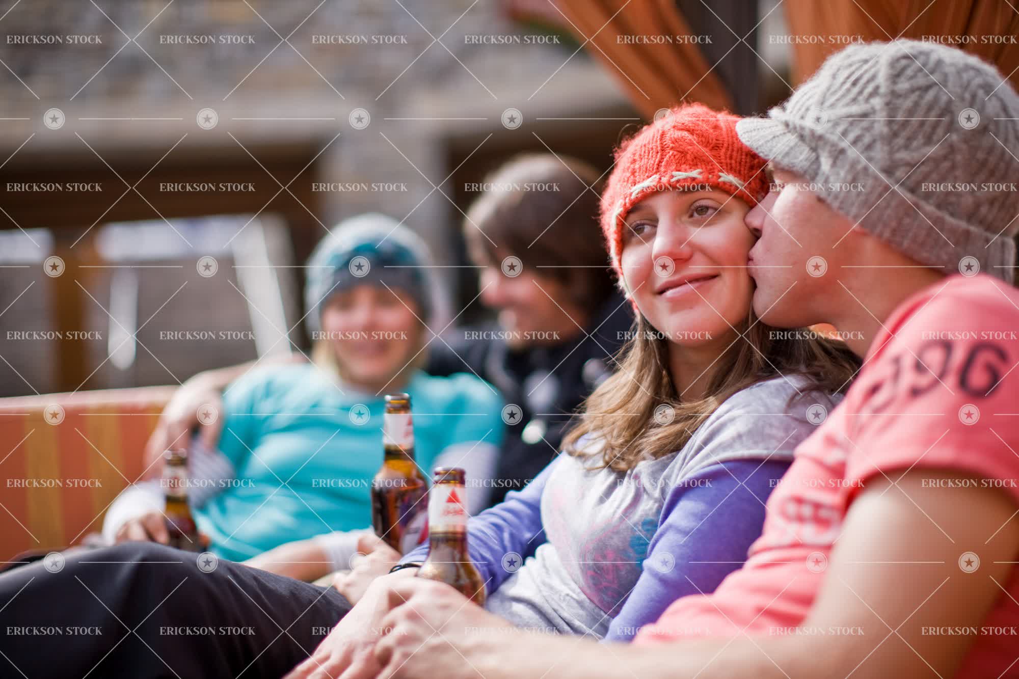 Tags adult, affectionate, alcohol, arm around, beanie, beer, beer bottle, bottle, brunette, caucasian, comfort, couch, couple, day, drink, enjoyment, female, friend, friends, friendship, Furniture, group, half length, happiness, happy, hat, hats, heterosexual couple, heterosexual couples, holiday, holidays, horizontal, kiss, Kissing, knit hat, knitted hat, lodge, lodges, lounge suite, lounge suites, love, loving, male, man, outdoor, outdoors, outside, partner, patio, patios, person, relationship, relationships, relax, Relaxation, relaxed, relaxes, relaxing, resort, resorts, selective focus, settee, sit, sitting, ski holiday, ski lodge, ski lodges, ski resort, ski resorts, ski wear, small group of people, smile, smiling, Sofa, sofas, together, togetherness, tourist destination, tourist destinations, travel, travel destination, travel destinations, Vacation, vacations, waist up, warm clothes, warm clothing, woman, young adult