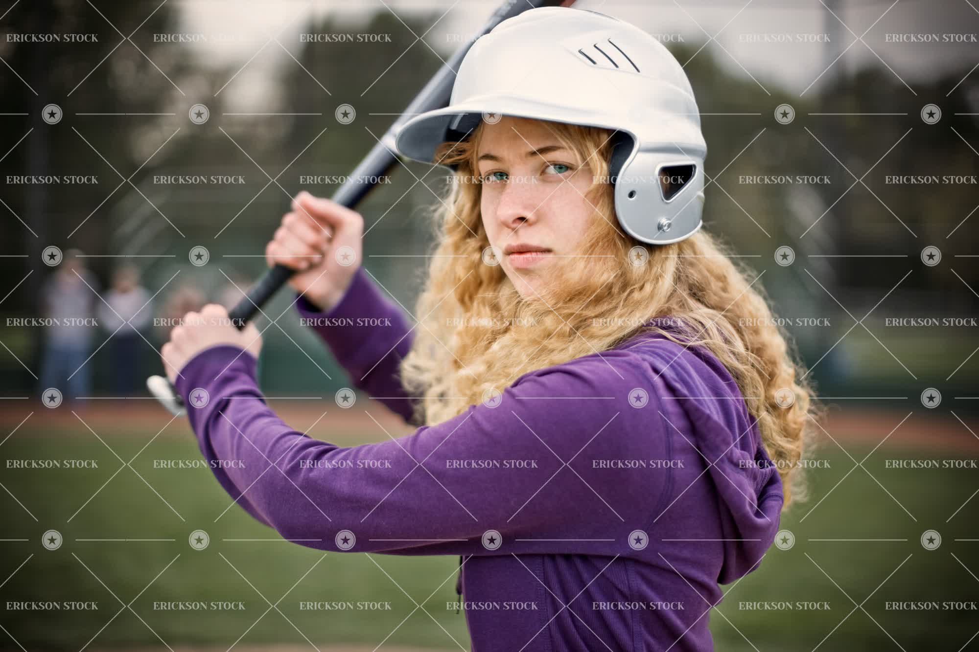 Tags adult, baseball, baseball bat, baseball field, baseball helmet, blond, casual clothes, caucasian, concentrate, day, determined, diamond, enjoyment, equipment, Eye contact, female, field, fields, frame, framed, game, games, girl, girls, grass, green, half length, helmet, helmets, hitter, hitters, hitting, horizontal, leisure, leisure activities, leisure activity, look at camera, looking at camera, one person, outdoor, outdoors, outside, people, person, play, Playing, playing field, playing fields, plays, Protective clothing, protective gear, purple, selective focus, sport, sport equipment, sporting equipment, Sports, Sports equipment, sports field, sports fields, stand, standing, teenage girl, teenager, towhead, vignette, waist up, woman, young adult
