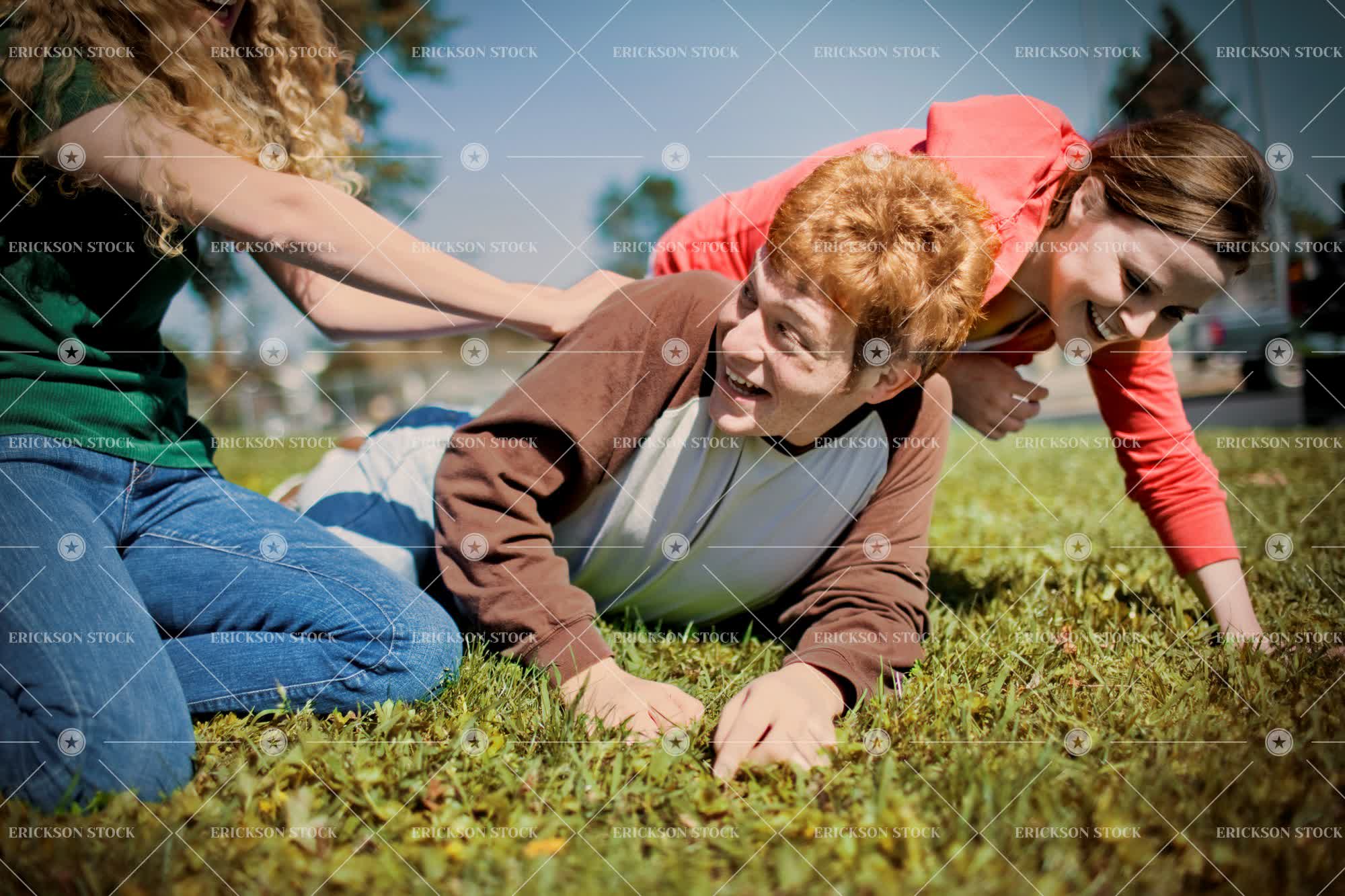Tags adult, baseball, baseball shirt, blue, blue jeans, boy, brunette, casual clothes, caucasian, companion, day, denim, enjoyment, female, field, fields, frame, framed, friend, friends, friendship, girl, girls, grass, green, half length, happiness, happy, horizontal, jeans, laughing, leisure, leisure activities, leisure activity, lie down, lie on front, Lying down, lying on front, male, man, outdoor, outdoors, outside, Park, people, play, play fight, play fighting, play fights, Playful, Playing, playing field, playing fields, plays, redhead, relax, Relaxation, relaxed, relaxes, relaxing, rough housing, satellite view, selective focus, smile, smiles, smiling, sports field, sports fields, teenage boy, teenage girl, teenager, three quarter length, together, togetherness, vignette, waist up, woman, wrestling, young adult