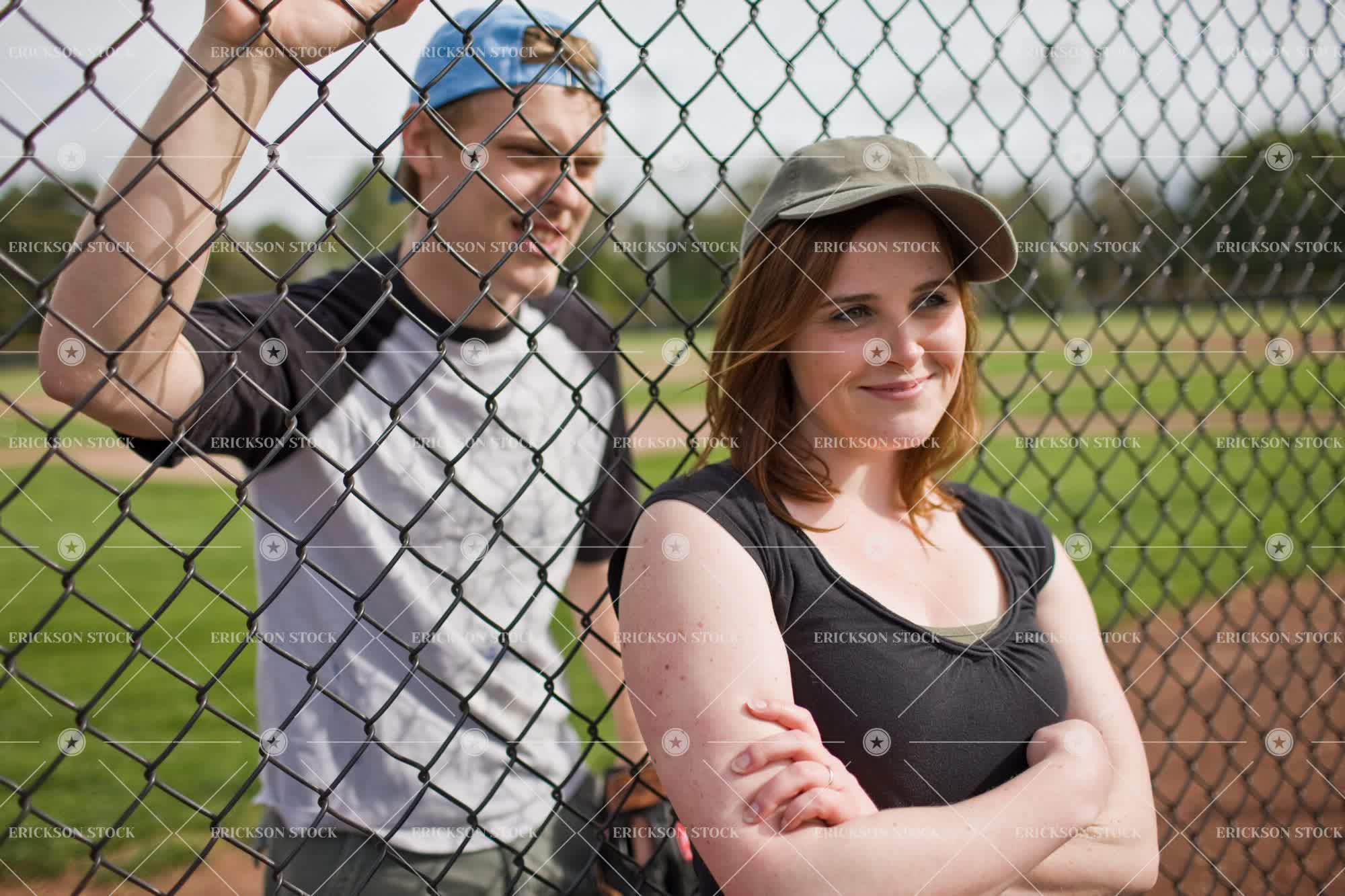Tags adult, arms crossed, baseball, baseball cap, baseball field, cap, caucasian, day, equipment, female, Fence, fenced, fences, folded arms, friend, friends, friendship, game, games, half length, happiness, happy, hat, hats, head, head & shoulders, head and shoulders, head shot, headshot, horizontal, leisure, leisure activities, leisure activity, leisurely, male, man, outdoor, outdoors, outside, people, person, playing field, playing fields, recreation, recreational pursuit, recreational pursuits, selective focus, shoulders, smile, smiling, softball, softball field, softball fields, softball pitch, softball pitches, sport, sport equipment, sport field, sport fields, sporting equipment, Sports, Sports equipment, teenager, together, togetherness, two people, waist up, wire, wire mesh, woman, young adult